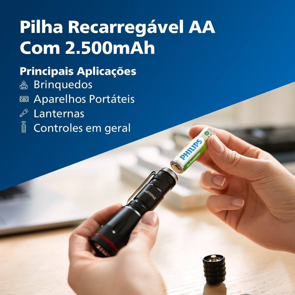 Desempenho superior ¿ Tecnologia de NiMH para múltiplas recargas ¿ Aproveite a capacidade total a cada utilização ¿ Aproveite a capacidade total a cada utilização ¿ AA recarregável de 2.500 mAh para uma utilização mais duradoura ¿ Capacidade da bateria: 2.500 mAh ¿ Tipo da bateria: Níquel hidreto metálico AA ¿ Tensão da pilha: 1,2 volt Especificações ambientais ¿ Composição química: Níquel hidreto metálico ¿ Metais pesados: Sem Cd, Sem Hg ¿ Material de embalagem: Papelão, PET ¿ Tipo da embalagem: PET blister Embalagem externa ¿ Embalagem externa (L x L x A): 31 x 20,8 x 20,6 cm ¿ Peso líquido: 9,280 kg ¿ Peso bruto: 11,1 kg ¿ Peso da embalagem: 1,820 kg Dimensões da embalagem ¿ Dimensões da embalagem (L x A x P): 8,3 x 12 x 1,65 cm ¿ Peso líquido: 0,116 kg ¿ Peso bruto: 0,121 kg ¿ Peso da embalagem: 0,005 kg ¿ EAN: 48 95229 11953 6 ¿ Número de produtos inclusos: 4 ¿ Tipo da embalagem: Embalagem em blister