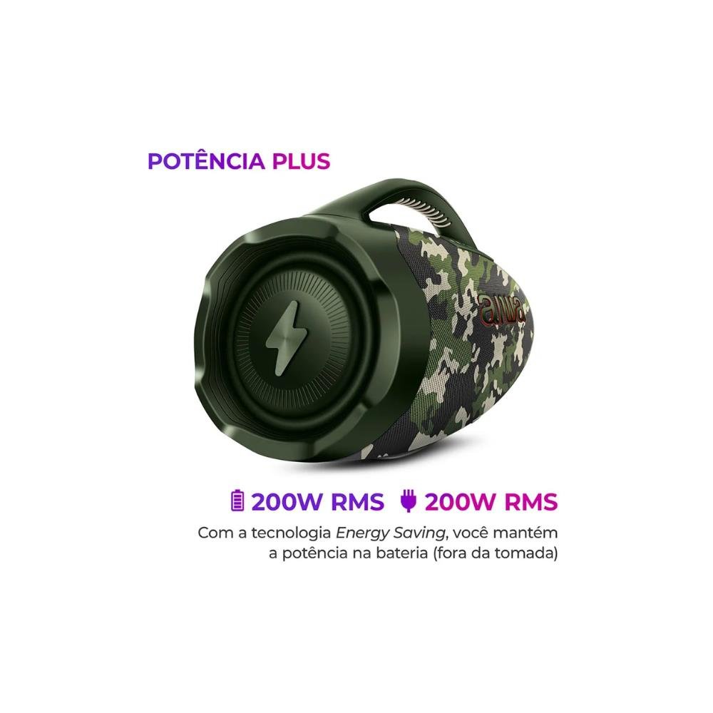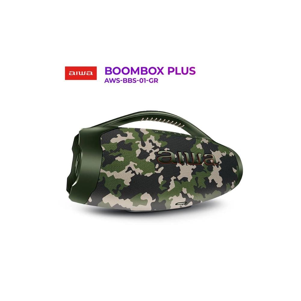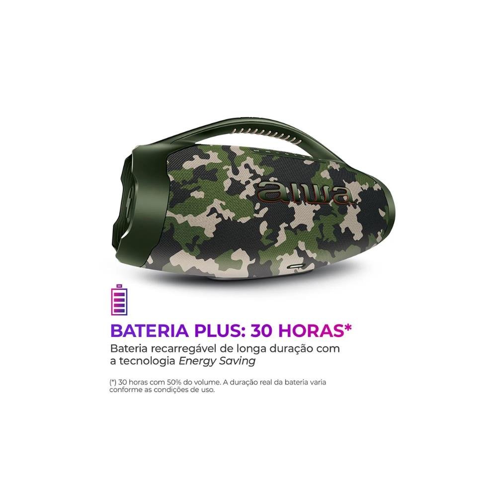 Caixa de Som Boombox Plus AIWA BBS-01-GR 200W BT 30H IP66 USB Verde A Caixa de Som Boombox Plus AIWA BBS-01-GR é ideal para quem ama som potente e festas em qualquer lugar. Com 200W RMS, 30 horas de bateria, Bluetooth 5.3 e proteção IP66 contra água e poeira, ela é perfeita para reuniões com amigos, viagens, praia ou piscina. Ideal para quem busca qualidade sonora premium, resistência e liberdade para levar a música aonde quiser. Reunir nossa família e amigos e desfrutar de uma boa música é um dos prazeres da vida, né? Curta um som potente e de alta definição com a Boombox Plus AWS-BBS-01-GR! A caixa de som portátil foi projetada com sistema de som de 3 vias - 1 subwoofer, 2 midranges e 2 tweeters -, além de ter dois radiadores passivos laterais, 200W RMS de potência e o DNA japonês da marca AIWA. Com o certificado IP66, você e sua turma podem ouvir sua playlist favorita na beira da piscina ou na praia sem preocupação, já que a Boombox é resistente a jatos potentes de água e tem proteção total contra poeira. Incrível, né? Saiba mais sobre a Boombox Plus AWS-BBS-01-GR: 200W RMS DE POTÊNCIA Sinta a experiência sonora impactante com os 200W RMS de potência da caixa portátil AIWA. Você será levado pela música com graves mais profundos e som potente. E, com a tecnologia Energy Saving, você mantém os 200W de potência até ouvindo música na bateria (fora da tomada). SOM DE ALTA DEFINIÇÃO COM 3 VIAS Preencha o ambiente com um som AIWA potente! Projetado com o sistema de som de 3 vias (3-Way Speaker System), a Boombox Plus AWS-BBS-01-GR possui 1 subwoofer, 2 midranges e 2 tweeters, além de 3 amplificadores de áudio, um para cada canal (grave, médio e agudo), e com resposta de frequência dinâmica de 20Hz - 20KHz. O resultado? Uma experiência sonora com a pureza do DNA japonês AIWA®! Garantia de vocais claros e nitidez nos detalhes, assegurando um som perfeito e sem distorções. RADIADORES PASSIVOS A Boombox conta com dois radiadores passivos laterais, que atuam em conjunto com os alto-falantes para aprimorar a propagação do som. PROTEÇÃO IP66: RESISTENTE A POEIRA + ÁGUA Caixa de som duplamente protegida: check! Você pode fazer uma festa na beira da piscina ou curtir uma música à beira-mar, que sua boombox estará protegida! O certificado IP66 garante resistência a jatos potentes de água e resistência total contra poeira. ATÉ 30 HORAS DE BATERIA Divirta-se em todos os momentos com as músicas que você ama: do treino matinal até uma noite com os amigos. Com até 30 horas* de bateria, você pode ouvir suas playlists o dia todo e ainda noite adentro, sem precisar recarregar. (*) 30 horas com 50% do volume e luzes desligadas. A duração real da bateria varia conforme as condições de uso. POTÊNCIA PLUS Se mantém 100% de potência tanto na bateria quanto na tomada. BLUETOOTH 5.3 Faça o pareamento da caixa de som portátil com seu smartphone via Bluetooth e curta suas playlists! Com a versão 5.3, a conexão é mais rápida e estável e o consumo de bateria é menor. FUNÇÃO TWS: DUPLIQUE SUA EXPERIÊNCIA Com a tecnologia TWS (True Wireless Sound), você sincroniza duas Boombox Plus AWS-BBS-01-GR e duplica a potência sonora. SEU SOM TA ON Controle as batidas da sua boombox pelo celular baixando o aplicativo AIWA Brasil. LEVE PARA QUALQUER LUGAR! Com a alça de transporte, fica fácil levar suas músicas favoritas com você para onde quiser. ESPECIFICAÇÕES Produto:AWS-BBS-01-BG Formato de Áudio:MP3, WAV, FLAC, WMA Frequência Rádio FM: Não Distância de conexão Bluetooth:5.3 Potência:200W RMS Voltagem de trabalho: Bivolt Entradas: USB Código ANATEL:13069-23-11704