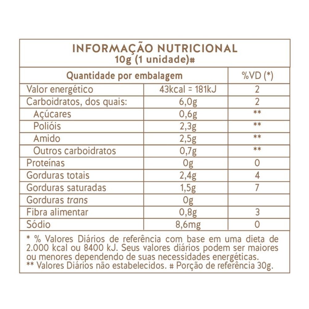 Ingredientes Biscoito de Arroz Integral, Gordura Vegetal Fracionada Equivalente à Manteiga de Cacau, Farinha de Arroz, Alfarroba em Pó, Polidextrose, Maltodextrina DE 10 e Óleo de Coco Extra Virgem. Edulcorante Maltitol, Emulsificante Lecitina de Girassol e Aromatizantes. Informações Adicionais ALÉRGICOS: PODE CONTER AMÊNDOA, AVELÃ, CASTANHA DE CAJU E NOZES. NÃO CONTÉM GLÚTEN. Este produto pode ter efeito laxativo.