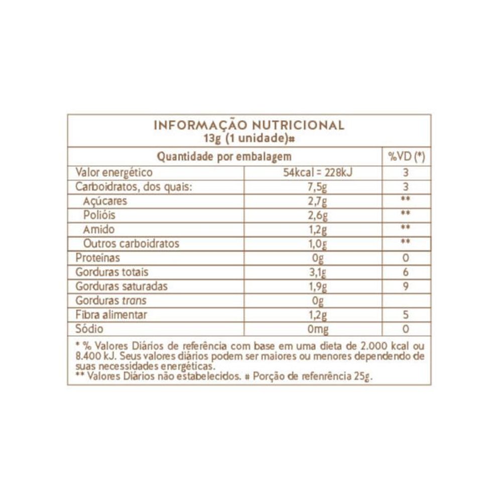 O Tablete de Alfarroba com Uva-Passa da Carob House faz bem até para coração. Afinal, a uva-passa possui polifenóis que tem ação anti-inflamatória que ajudam a previnir doenças cardíacas. Ingredientes Uva-Passa, Gordura Vegetal Fracionada Equivalente à Manteiga de Cacau, Alfarroba em Pó, Farinha de Arroz, Polidextrose e Maltodextrina DE 10. Edulcorante Maltitol, Emulsificante Lecitina de Girassol e Aromatizantes. Tablete de Alfarroba com Uva-Passa ALÉRGICOS: PODE CONTER AMÊNDOA, AVELÃ, CASTANHA DE CAJU E NOZES. NÃO CONTÉM GLÚTEN. Este produto pode ter efeito laxativo. Imagens meramente ilustrativas.