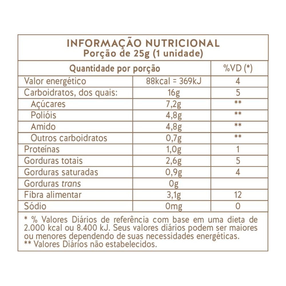Ingredientes Damasco Seco, Polidextrose, Farinha de Arroz, Nozes, Gordura Vegetal Fracionada Equivalente à Manteiga de Cacau, Alfarroba em Pó e Maltodextrina DE 10. Edulcorante Maltitol, Emulsificante Lecitina de Girassol e Aromatizantes. Informações Adicionais ALÉRGICOS: CONTÉM NOZES E PODE CONTER AMÊNDOA, AVELÃ E CASTANHA DE CAJU. NÃO CONTÉM GLÚTEN. Este produto pode ter efeito laxativo.