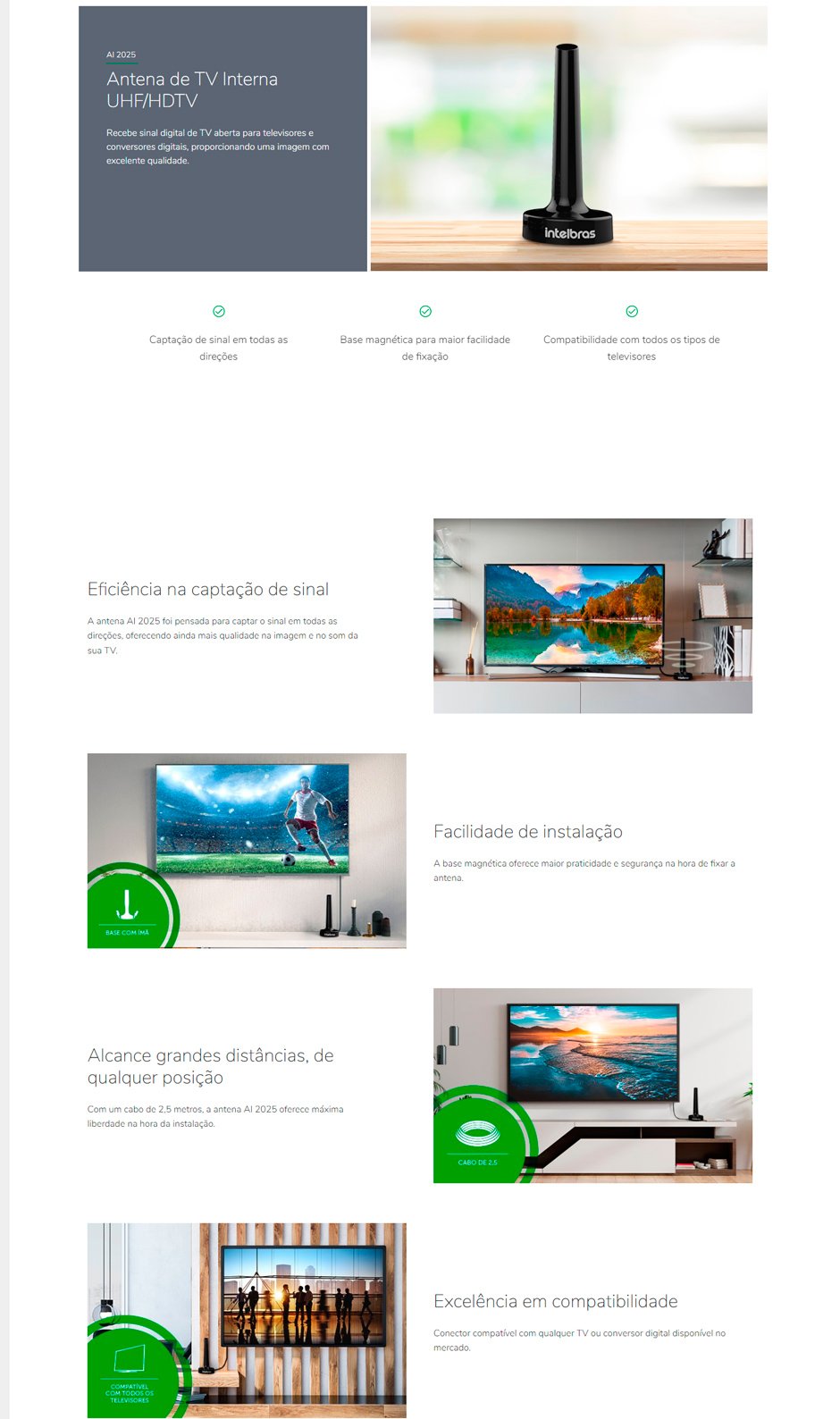 A AI 2025 é a antena de TV mais versátil do mercado. Com captação ominidirecional de sinal, garante alta qualidade de som e imagem e praticidade na instalação. Possui base magnética para fixação. Fácil e segura, e cabo de 2,5 metros.