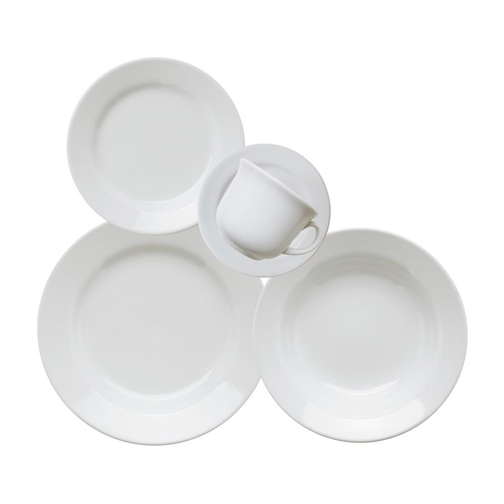 O branco é uma cor muito versátil e prática, porque fica bem em todas as ocasiões. Além disso, a louça branca é perfeita para quem prefere deixar o destaque da refeição para a comida servida. Itens inclusos: - 4 Pratos Rasos 24cm; - 4 Pratos Fundos 21cm; - 4 Pratos Sobremesa 18cm; - 4 Xícaras de Chá 200mL; - 4 Pires de Chá 14cm; - Pode ser levado ao: Micro-ondas e Lava-Louças. Referência de Fábrica: 142002