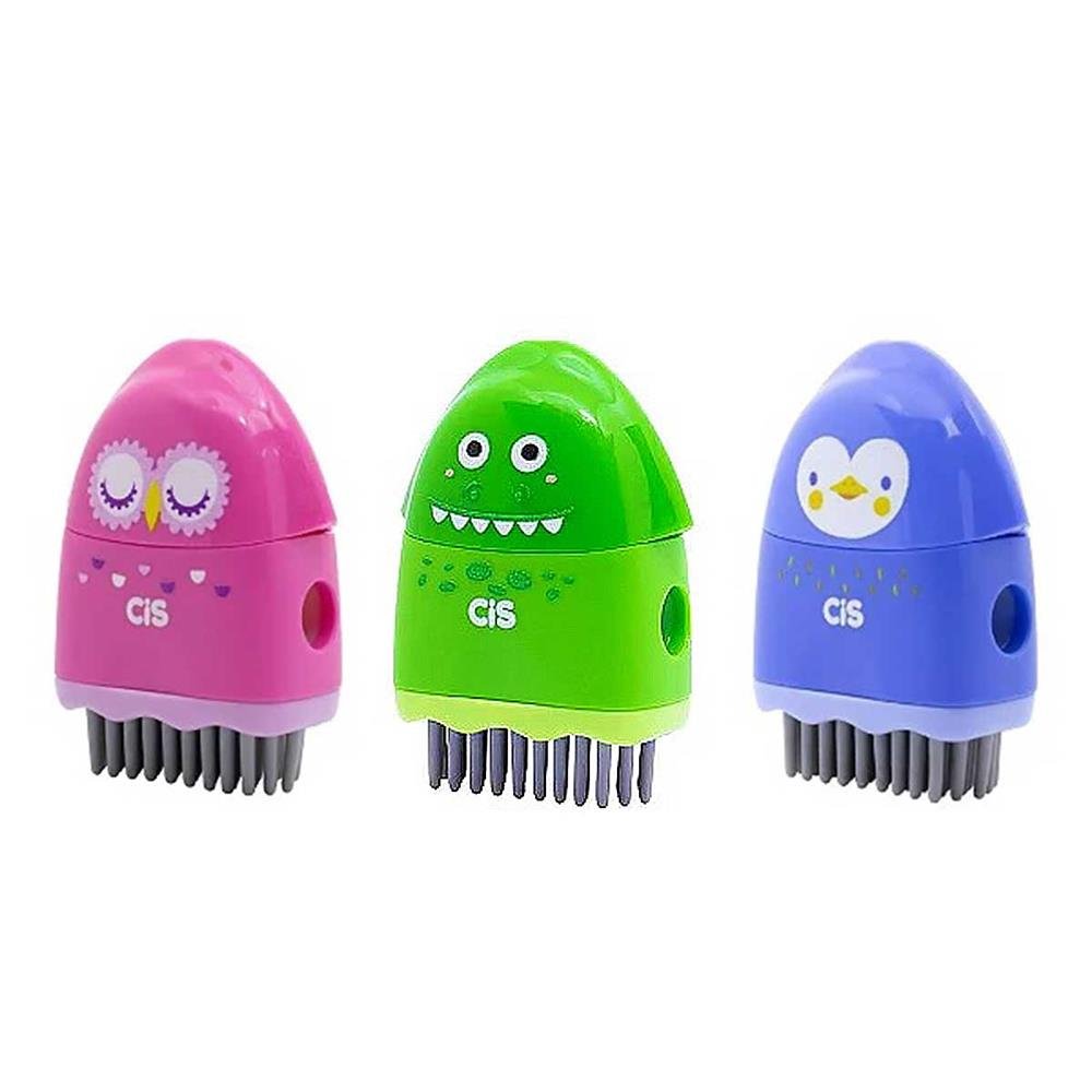 Marca: CIS Modelo: Criatic 3 em 1 Funções: Apontador, borracha, escova Material: Plástico Modelos: 3 modelos decorados Quantidade: Caixa com 12 unidades Uso: Escolar, profissional, doméstico Como Usar: