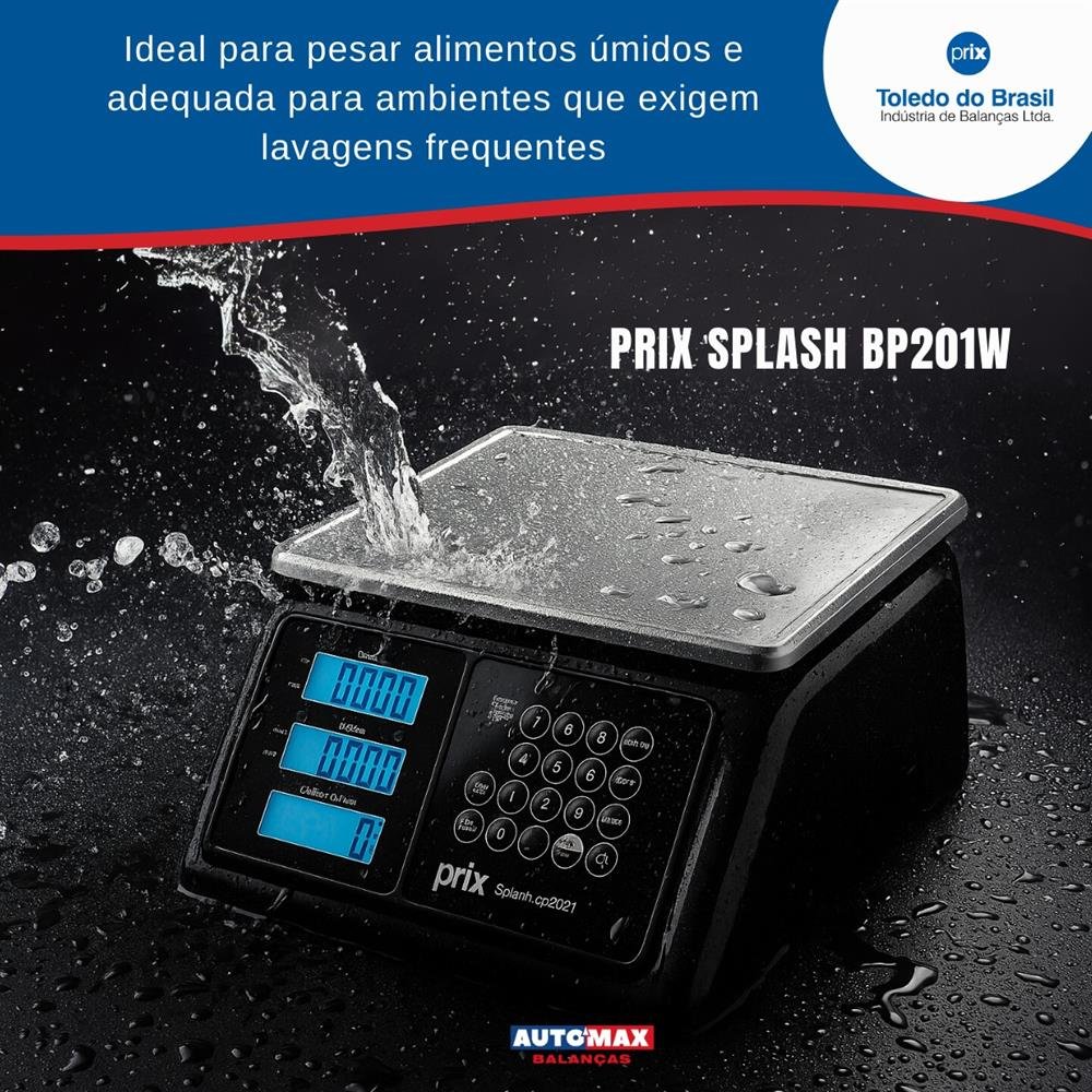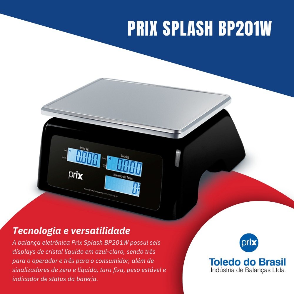 Marca: Toledo do Brasil (Prix) Modelo: BP201W000 (Prix Splash) Capacidade Máxima: 32kg Divisões (Pesagem): De 0 a 6kg: divisão de 2g De 6 a 15kg: divisão de 5g De 15 a 32kg: divisão de 10g Grau de Proteção: IPX7 (Resistente à imersão e jatos d'água) Dimensões do Prato: 280mm x 220mm Alimentação: Fonte bivolt automática (110V/220V) e bateria interna. ¿¿ Conteúdo da Embalagem: