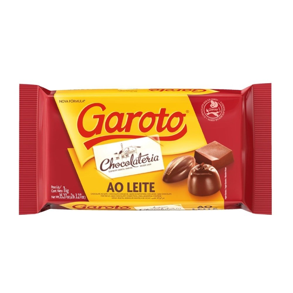 Barra de chocolate garoto ao leite 1kg. Ideal para o preparo de receitas e momentos especiais.