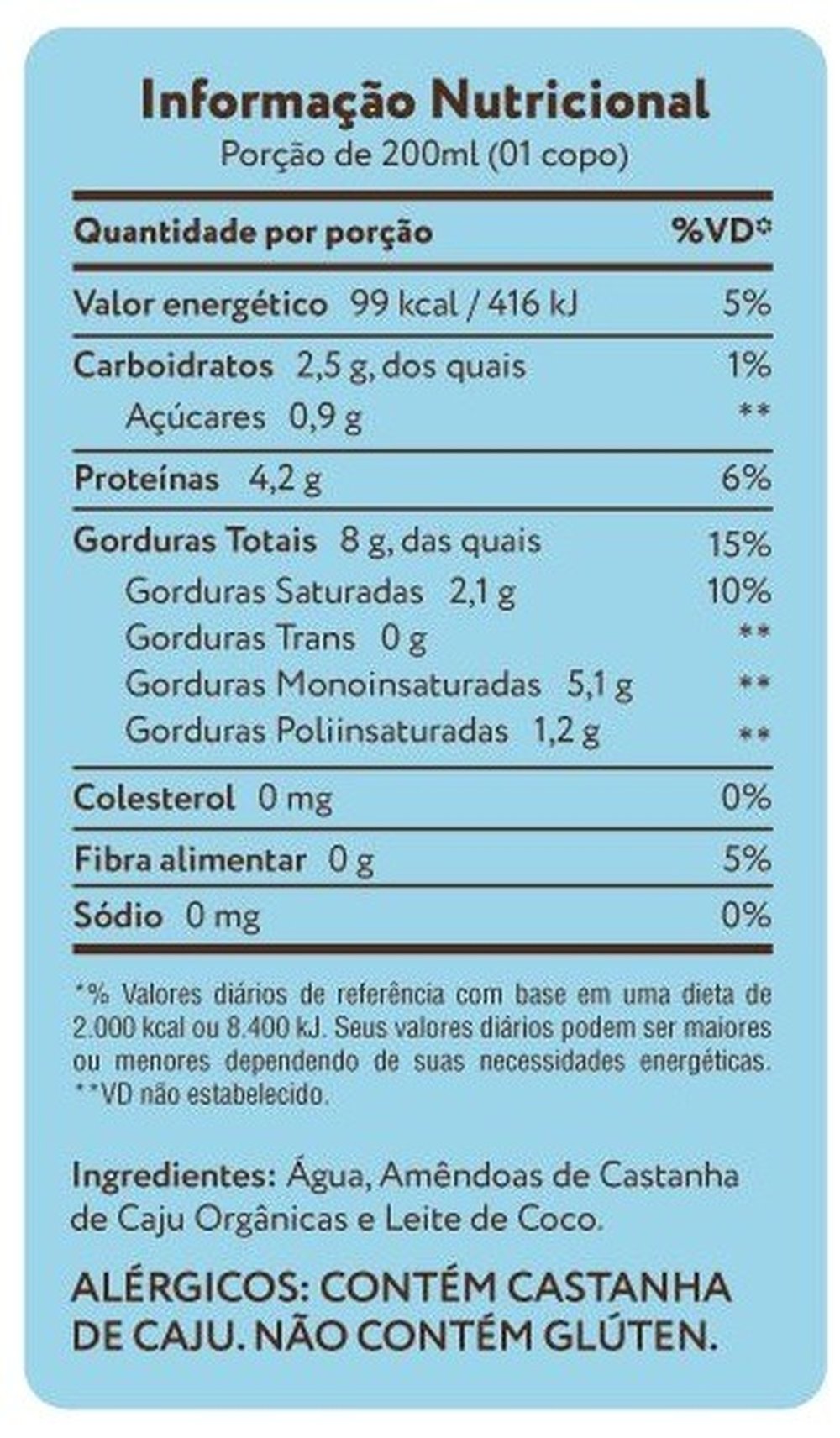 Castanhas De Caju As Castanhas De Caju São A Base Desse Alimento. Elas São Responsáveis Pela Entrega De Nutrientes, Sabor, Cor E Pelo Aspecto Cremoso. As Castanhas De Caju Possuem Proteínas De Alta Qualidade E São Uma Ótima Fonte De Boas Gorduras E Minerais. Água A Água... Bem, Ela Está Aqui Para Tornar Essa Bebida Realidade. Leite De Coco A Mistura De Coco E Castanhas Se Transforma Em Uma Bebida Com Um Sabor Delicioso, Perfeito Para Ser Usado Em Receitas. Essa Mistura Tropical É Naturalmente Rica Em Ômega 9, Vitaminas, Minerais E Uma Fonte De Proteínas De Alta Qualidade E Fibras.