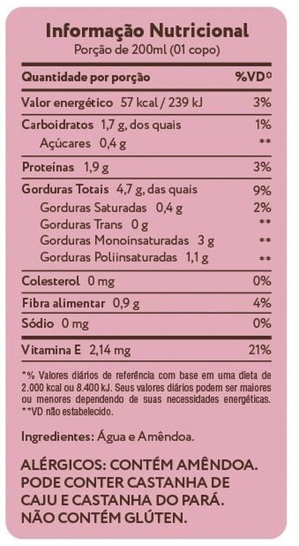 A Bebida a Base de Amêndoas (1000ml) A tal da Castanha é cheia de nutrientes, como a vitamina E e o magnésio, possui pouca gordura, é menos calórica e tem um sabor único e suave. Elas também possuem proteínas de alta qualidade e são uma ótima fonte de boas gorduras.