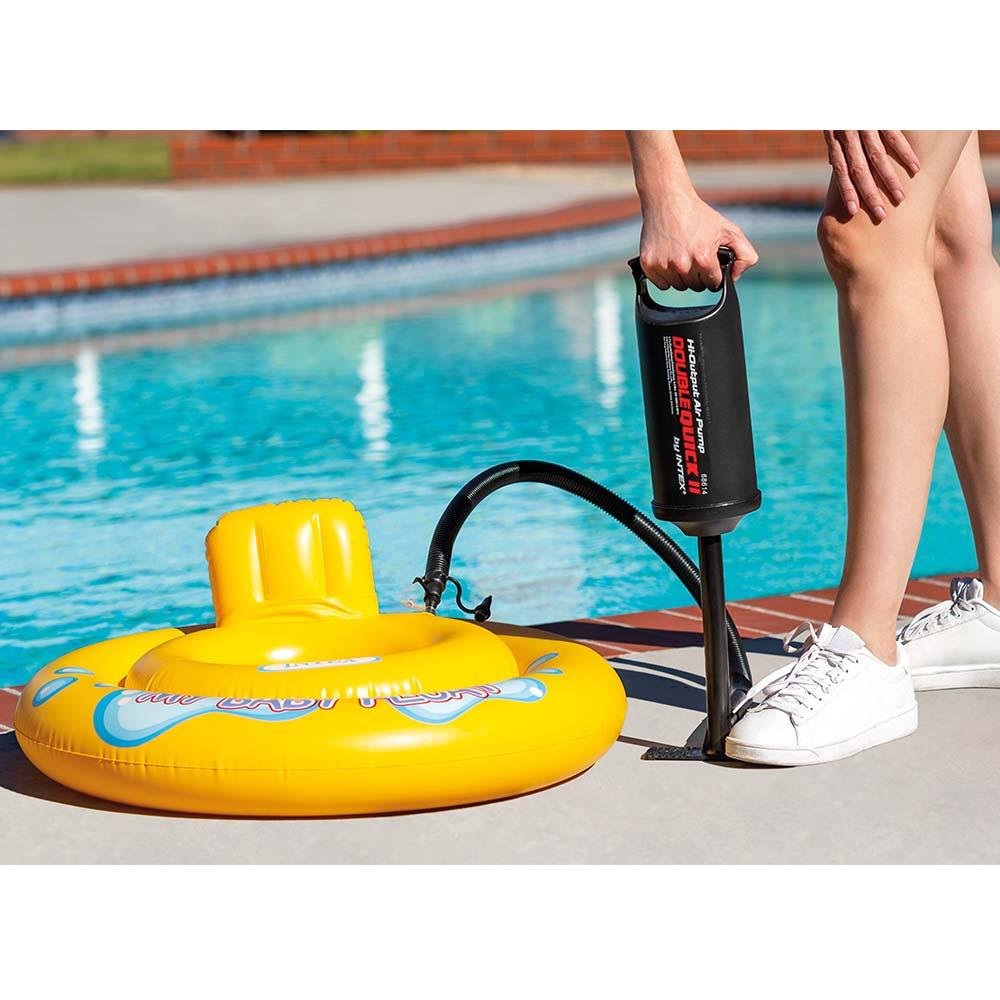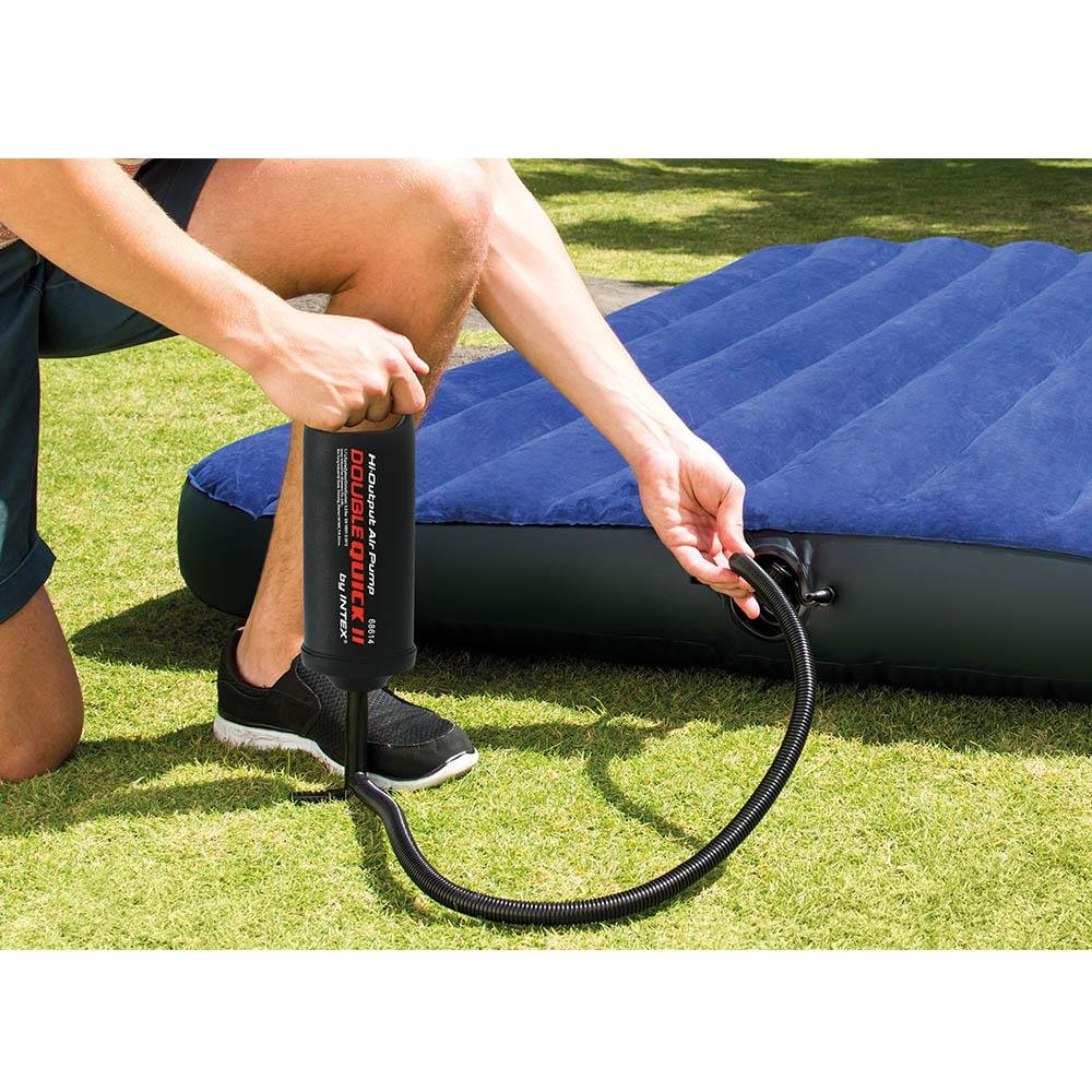 Bomba de ar manual de dupla ação de 36cm. A mangueira de estilo acordeão contém 3 tipos de bocais diferentes para encaixar a maioria de válvulas. Função para encher/esvaziar. Apto para inflar bolas de até 0,55 bar. Para a diversão na praia ou piscina ou para encher colchões e outros infláveis, a bomba vai ajudar a você terminar mais rápido e aproveitar melhor o dia!