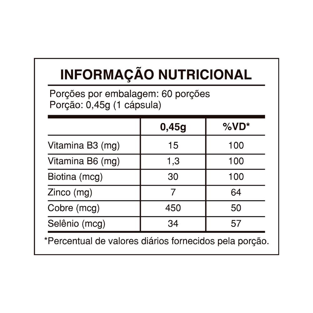 A biotina contribui para a manutenção do cabelo e da pele. O zinco contribui para a manutenção do cabelo, da pele e das unhas.