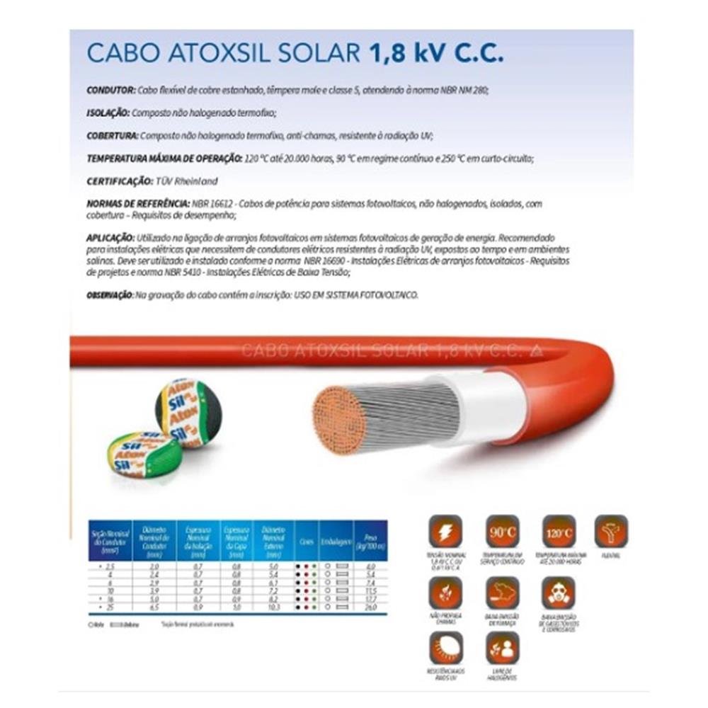 APLICAÇÃO: Utilizado na ligação de arranjos fotovoltaicos em sistemas fotovoltaicos de geração de energia. Recomendado para instalações elétricas que necessitem de condutores elétricos resistentes à radiação UV, expostos ao tempo e em ambientes salinos. Deve ser utilizado e instalado conforme a norma ABNT de Instalações Elétricas de Baixa Tensão - Arranjos Fotovoltaicos e norma NBR 5410 Instalações Elétricas de Baixa Tensão. CONDUTOR: Cabo flexível de cobre estanhado, têmpera mole e classe 5, atendendo à norma NBR NM 280. ISOLAÇÃO: Composto não halogenado termofixo. COBERTURA: Composto não halogenado termofixo, anti-chamas, resistente a radiação UV. TEMPERATURAS MÁXIMAS DE OPERAÇÃO: 120ºC até 20.000 horas, 90ºC em serviço contínuo e 250ºC em curto-circuito. NORMAS DE REFERÊNCIA: NBR 16612 - Cabos de potência para sistemas fotovoltaicos, não halogenados, isolados, com cobertura, para tensão de até 1,8 kV C.C. entre condutores - Requisitos de desempenho. NORMAS APLICÁVEIS: NBR NM 280. OBSERVAÇÕES: Na gravação do cabo contém a inscrição: USO EM SISTEMA FOTOVOLTAICO. CARACTERÍSTICAS ¿ Tensão Nominal: 1,8 kV C.C. ¿ Temperatura Máxima 90º