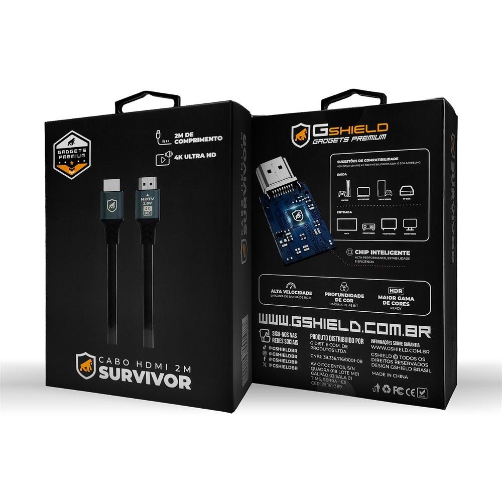 Cabo HDMI modelo Survivor, com 2 metros de comprimento. Projetado para fornecer alta qualidade de áudio e vídeo, é ideal para conexões entre dispositivos de entretenimento, garantindo uma transmissão clara e estável. Cor preta para um visual elegante.