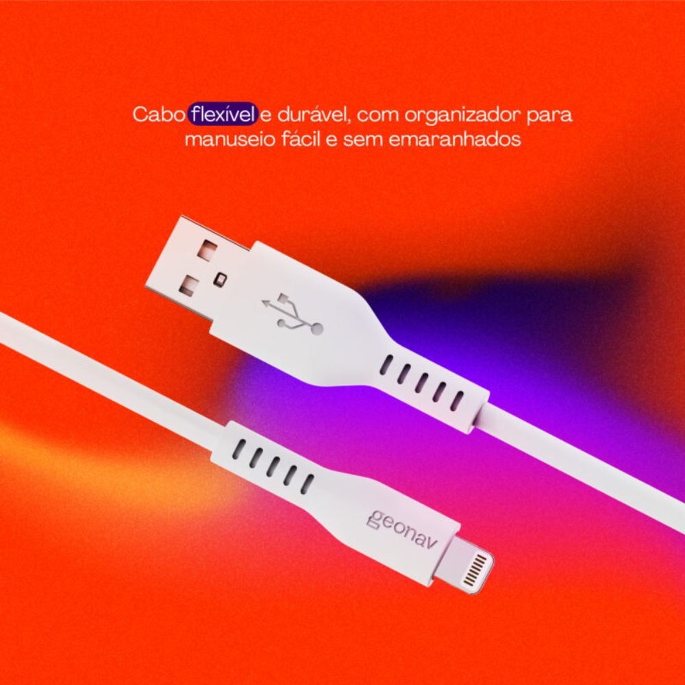 O Cabo USB-A para Lightning Geonav Silicone 1,5m é a escolha perfeita para quem busca qualidade, durabilidade e conforto no dia a dia. Fabricado em silicone premium, ele é ultraflexível, resistente a dobras e possui toque macio, evitando nós e danos causados pelo uso intenso. Com suporte a 2.4A e 12W, garante carregamento eficiente e seguro para seus dispositivos Apple. Perfeito para uso em casa, no trabalho ou no carro!