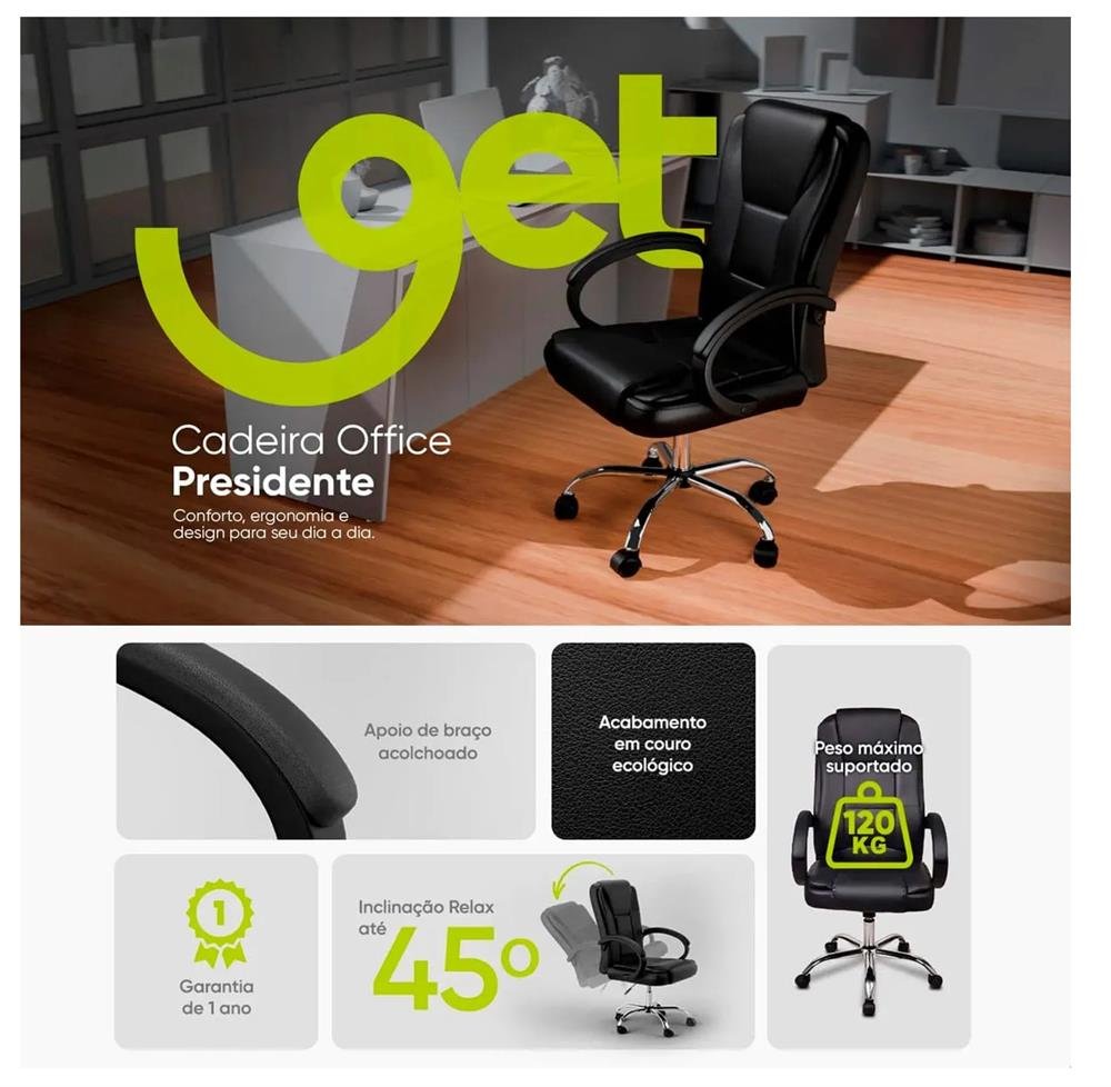 Invista em ergonomia, durabilidade e estilo com a Cadeira GET Presidente. Ideal para quem busca desempenho e elegância no dia a dia profissional. Transforme sua rotina de trabalho com a Cadeira Presidente GET, um modelo que une design sofisticado, conforto premium e resistência para quem passa longas horas em frente à mesa. Produzida com couro ecológico macio e resistente na cor preta, essa cadeira oferece um toque moderno e executivo ao ambiente, sem abrir mão da sustentabilidade.