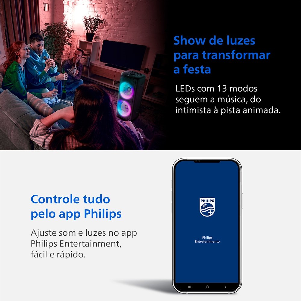 Você pode controlar o volume, as luzes e os efeitos de karaokê pelo painel do alto-falante ou usar o aplicativo Philips Entertainment, que também permite ajustar as frequências de graves e agudos