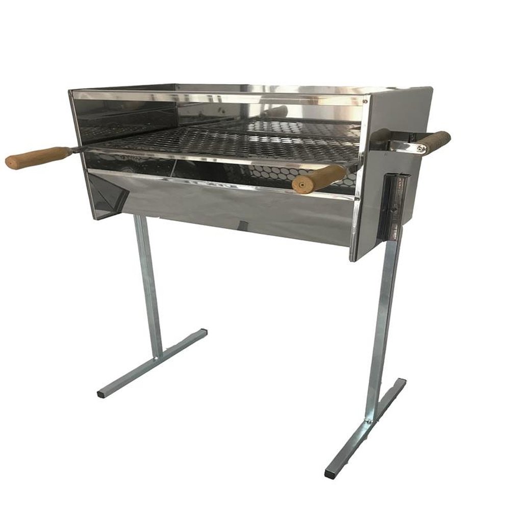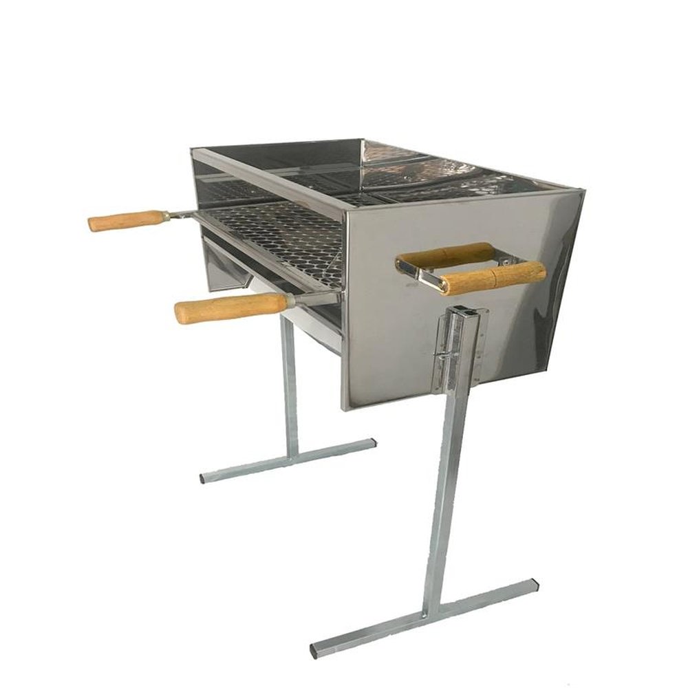 Churrasqueira fabricada em Aço Inox , acompanha 1 grelha também em Aço Inox com cabos de madeira, que facilitam a mudança de altura com relação ao braseiro , tem possibilidade de ajustar a altura em 3 posições . Os pés em "T" são fabricados em tubos quadrados , robustos e galvanizados para preservar o produto contra interpéries do tempo , com um sistema muito fácil de montagem , basta encaixar os pés nos suportes laterais . Possui alças laterais de madeira deixando a churrasqueira com maior mobilidade , mesmo em funcionamento. Seu designer possibilita maior concentração de calor , altura excelente para a utilização e fácil limpeza. Atende 25 pessoas . DIMENSÕES Profundidade: 29 cm