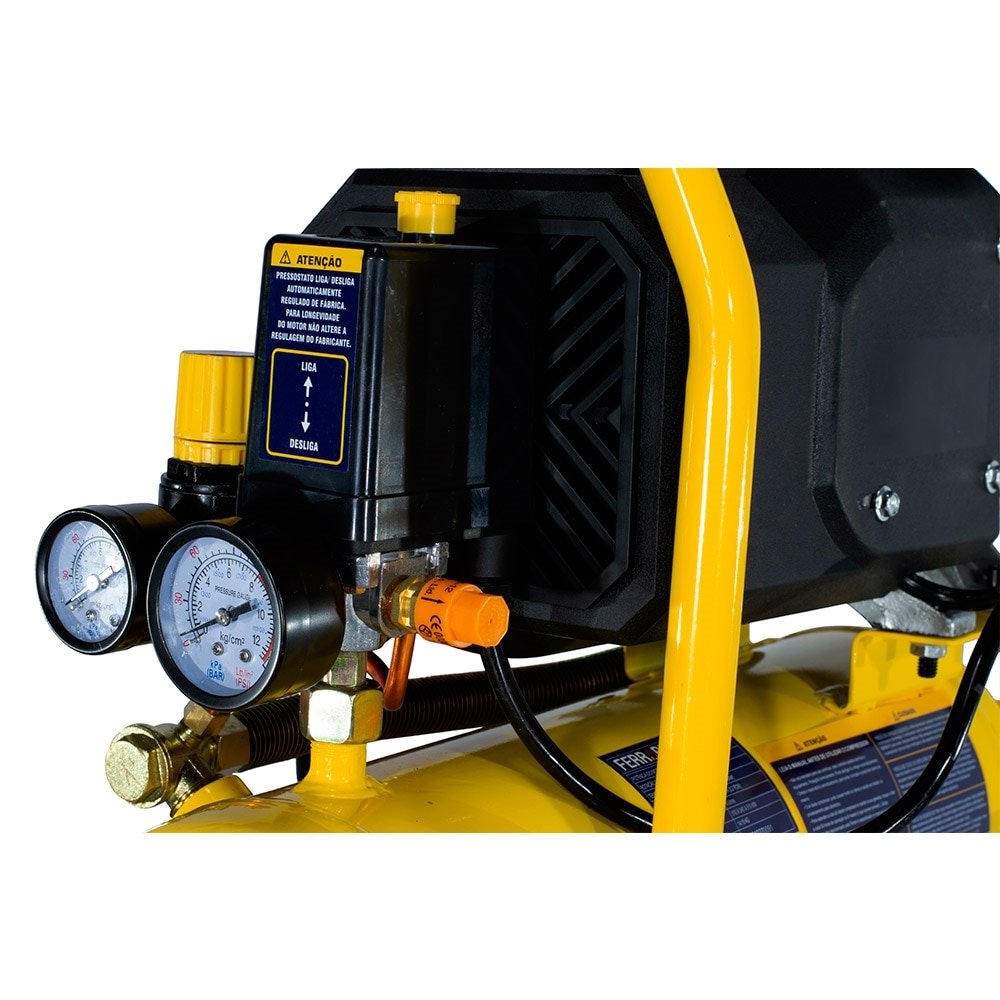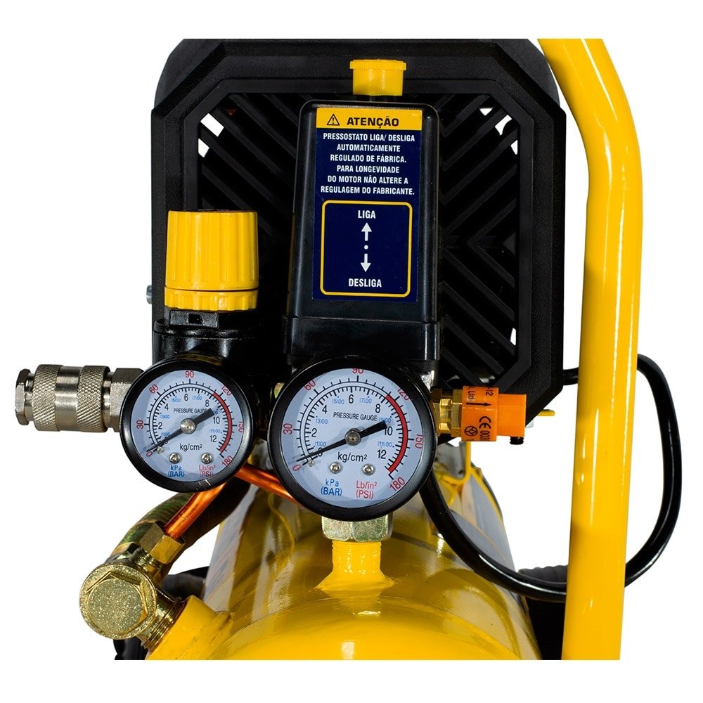 Ideal para pintar, pulverizar e inflar Indicados no uso doméstico ou profissional.1 Engate Rápido ¿ Fácil de operar, ganha tempo e facilita o trabalho. 2 manômetros ¿ Auxiliando a eficiência e a qualidade do trabalho/pintura (1 para monitorar a pressão no tanque e outro para o processo). Liga-desliga automático. Registro de pressão Ajustável ¿ Para uma pintura ideal.Potência do motor: 1 HP (750W) Rotação do motor: 3400 RPM Tensão nominal: 220V Pressão máxima de trabalho: 115 Lbs/pol² [8bar] Deslocamento teórico (vazão): 5,5 PCM Capacidade do reservatório de ar: 6L