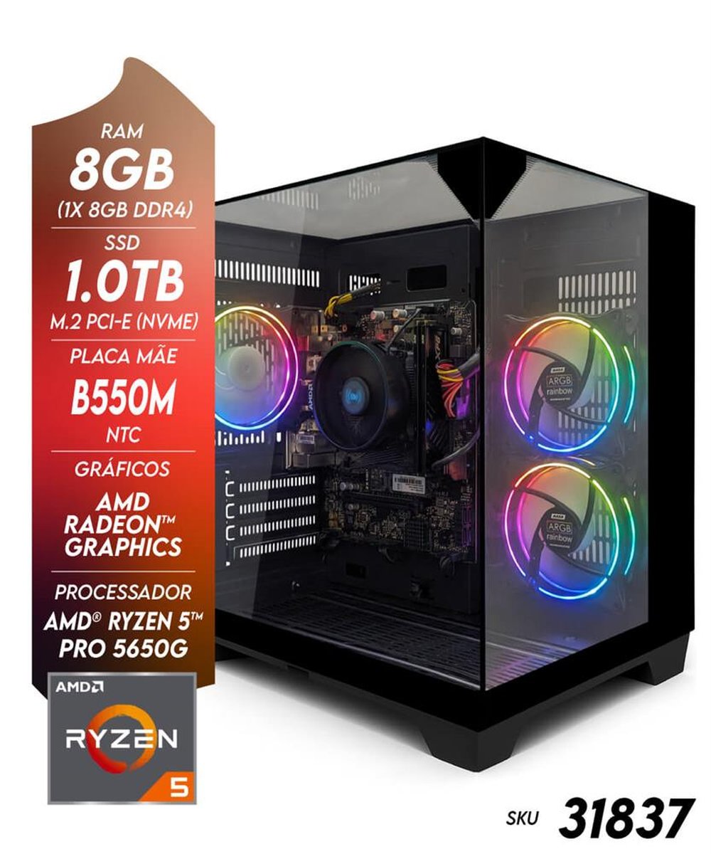 ¿¿ Computador Gamer NTC Vulcano AMD - AQ 1025 TC O Computador Gamer NTC Vulcano AMD - AQ 1025 TC entrega potência, velocidade e estilo em uma configuração moderna e equilibrada. Ideal para quem busca iniciar no mundo dos games ou precisa de uma máquina versátil para trabalho e entretenimento, este modelo combina o desempenho do AMD Ryzen 5 Pro 5650G, SSD NVMe de 1TB, 8GB de memória DDR4 e o Windows 11 Pro (versão de avaliação), garantindo rapidez, estabilidade e amplo espaço de armazenamento. No centro da configuração está o processador AMD Ryzen 5 Pro 5650G, com 6 núcleos e 12 threads e frequência de até 4.4GHz no modo Turbo. Ele oferece excelente desempenho multitarefa e gráficos integrados Radeon¿ Graphics, capazes de rodar diversos jogos populares e competitivos sem a necessidade imediata de uma placa de vídeo dedicada. Com arquitetura de 7nm, entrega alta eficiência e baixo consumo de energia. A placa-mãe NTC B550M é um dos destaques do conjunto, oferecendo suporte a tecnologias recentes e total compatibilidade com processadores Ryzen da série 5000. Ela traz conexões modernas e suporte a SSD NVMe, ideal para futuras expansões e upgrades de hardware. O sistema conta com 8GB de memória DDR4 3200MHz (1x8GB), garantindo fluidez para jogos leves e aplicações do dia a dia, com possibilidade de expansão para até 64GB ¿ o que potencializa o desempenho dos gráficos integrados. O SSD NVMe de 1TB proporciona inicializações ultrarrápidas e muito espaço para jogos, programas e arquivos, com velocidades de leitura de até 1700MB/s. A fonte de 500W reais, com eficiência 80 Plus, assegura energia estável e segura para todos os componentes, preparada para suportar futuras placas de vídeo dedicadas. Já o gabinete gamer Aquário Visão Infinita CG-K3D3, com painéis em vidro temperado e três fans ARGB inclusas, oferece visual moderno, excelente ventilação e acabamento premium, ideal para quem valoriza design e desempenho. O Windows 11 Pro (versão de avaliação) vem pré-instalado, oferecendo uma interface moderna e intuitiva, com recursos avançados de segurança e produtividade. Para uso completo, é necessário ativar o sistema com uma chave digital válida adquirida separadamente. ¿¿ Principais Características Processador: AMD Ryzen 5 Pro 5650G (6 núcleos / 12 threads, até 4.4GHz, 16MB Cache) Gráficos Integrados: Radeon¿ Graphics (1900MHz, até 16GB compartilhados) Placa-mãe: NTC B550M ¿ DDR4, HDMI, VGA, M.2 NVMe, 4x SATA Memória: 8GB DDR4 3200MHz (1x8GB, expansível até 64GB) Armazenamento: SSD M.2 NVMe 1TB (PCIe Gen3 x4, leitura até 1700MB/s) Fonte: 500W reais, eficiência 80 Plus, bivolt chaveada Gabinete: Aquário Visão Infinita CG-K3D3 ¿ vidro temperado, 3 fans ARGB Sistema Operacional: Windows 11 Pro 64 Bits (versão de avaliação) ¿¿ Especificações de Hardware Chipset: AMD B550