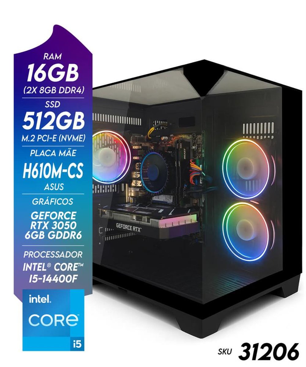 ¿¿ Computador Gamer NTC VULCANO Intel - AQ 2015 AS (Dual Channel) O NTC VULCANO AQ 2015 AS entrega excelente desempenho em jogos e multitarefas com a combinação do Intel Core i5 de 14ª geração e da GeForce RTX 3050 6GB. É a escolha ideal para quem quer jogar em Full HD com qualidade, criar conteúdo leve e manter várias aplicações abertas com fluidez ¿ tudo isso em um gabinete premium com vidro temperado e ARGB. ¿¿ Destaques do Produto Intel Core i5-14400F (14ª Geração): 10 núcleos (6P+4E) e 16 threads, até 4.7GHz Turbo ¿ potência para jogos atuais, streaming e tarefas pesadas. GeForce RTX 3050 6GB GDDR6 (128-bit): Ray Tracing e DLSS para FPS mais altos e visuais realistas em 1080p. 16GB DDR4 3200MHz em Dual Channel (2×8GB): resposta rápida no jogo e na multitarefa. SSD NVMe 512GB (PCIe Gen3 x4): sistema e jogos carregando em segundos (até 1700MB/s leitura / 1300MB/s gravação). Placa-mãe ASUS H610M-CS D4: base estável com PCIe 4.0 x16, M.2 NVMe e HDMI 2.1 (4K60). Fonte 500W Reais ¿ 80 Plus Bronze ¿ PFC Ativo: eficiência e estabilidade para a GPU e o processador. Gabinete Aquário Visão Infinita CG-K3D3: painel frontal/superior/lateral em vidro temperado, 3 fans ARGB inclusos e excelente fluxo de ar. Linux Mint Cinnamon 64 bits: sistema leve, seguro e pronto para uso. ¿¿ Especificações Técnicas ¿¿ Processador Intel® Core¿ i5-14400F | 10C/16T (6P+4E) | 1.8¿4.7GHz | Cache L3: 20MB | TDP 65W (até 148W) | Intel 7 | Soquete LGA1700 ¿¿ Placa-Mãe ASUS H610M-CS D4 (Micro-ATX 22,5 × 19,3 cm) Chipset: Intel® H610 Memória: 2× DDR4 U-DIMM (até 64GB, Dual Channel, suporte a XMP) Slots: 1× PCIe 4.0 x16, 1× PCIe 3.0 x1 Armazenamento: 1× M.2 2242/2260/2280 PCIe Gen3x4 (32 Gb/s), 4× SATA 6 Gb/s Vídeo onboard (para uso com CPUs com iGPU): HDMI 2.1 (4096×2160@60Hz), VGA/D-Sub (1920×1200@60Hz) Rede: Realtek RTL8111H Gigabit (10/100/1000), Wake-on-LAN, PXE Áudio: Realtek ALC897, 7.1 canais HD Traseiro: PS/2 KB + PS/2 Mouse, HDMI, VGA, 2× USB 3.2 Gen1, 4× USB 2.0, RJ-45, 3× Áudio HD ¿¿ Memória RAM 16GB (2×8GB) DDR4 3200MHz | UDIMM | Dual Channel | até 64GB ¿¿ Armazenamento SSD M.2 2280 NVMe PCIe Gen3 x4 | 512GB Velocidade: leitura até 1700MB/s | gravação até 1300MB/s ¿¿ Placa de Vídeo (Dedicada) NVIDIA GeForce RTX 3050 6GB GDDR6 | 128-bit | clock até 1800MHz Tecnologias: Ray Tracing, DLSS, DirectX 12, HDMI 2.1/DisplayPort (conexões dependem do modelo da placa) ¿¿ Gabinete Aquário Visão Infinita CG-K3D3 (vidro temperado frontal, superior e lateral 3mm) USB frontal: 1× USB 3.2 Gen1 Type-A + 2× USB 2.0 | Áudio HD Baias: 1× 3.5" + 2× 2.5" ou 3× 2.5" Suporte GPU: até 240mm | Cooler CPU: até 160mm Fans inclusos: 2× 120mm internos verticais + 1× 120mm traseiro (ARGB) Extras: filtro anti-poeira inferior | Suporte a water cooler: 120mm (traseiro) / 240mm (montagem vertical interna) Dimensões: 380 × 275 × 350 mm (gabinete) ¿¿ Fonte de Alimentação 500W Reais | 80 Plus Bronze | PFC Ativo ¿¿ Sistema Operacional Linux Mint Cinnamon 64 Bits (base Ubuntu/Debian) Interface moderna, pacote Office, navegador e multimídia inclusos Atualizações de segurança e desempenho gratuitas ¿¿ Conteúdo da Embalagem 1× Computador Gamer NTC VULCANO Intel - AQ 2015 AS (Dual Channel) 1× Cabo de força padrão NBR 14136 1× Manual de instruções ¿¿ Peso e Dimensões Dimensões do computador (A × L × P): 380 × 275 × 350 mm Dimensões da embalagem (C × L × A): 425 × 375 × 480 mm Peso bruto: 10,49 kg* * Com embalagem e acessórios.