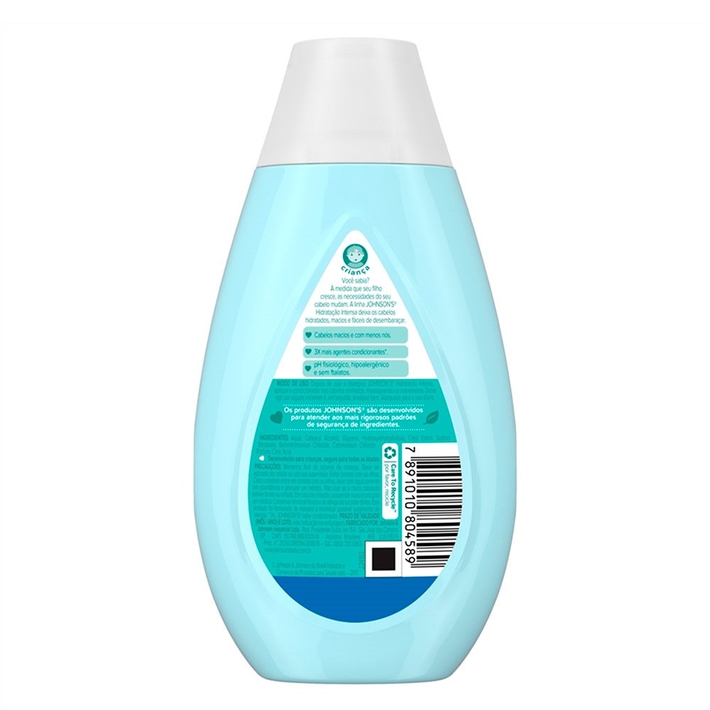 O cabelo das crianças é mais fino e delicado que o cabelo dos adultos. Por isso, criamos a linha JOHNSON¿S® desenvolvida para crianças, formulada com ingredientes naturais específicos para os pequenos: cabelos macios, brilhantes e saudáveis. O Shampoo Infantil JOHNSON'S® Hidratação Intensa, 200mL conta com 3X* mais agentes condicionantes e deixa os cabelos hidratados, macios e fáceis de desembaraçar, além de contar com a exclusiva fórmula chega de lágrimas, que evita irritação nos olhos. Toda a linha é hipoalergênica, formulada para ser suave, livre de corantes, parabenos, sulfatos e ftalatos. Com pH fisiológico e dermatologicamente testado. Frasco com 20% de plástico reciclado, cuidando do seu bebê e do futuro do nosso planeta.