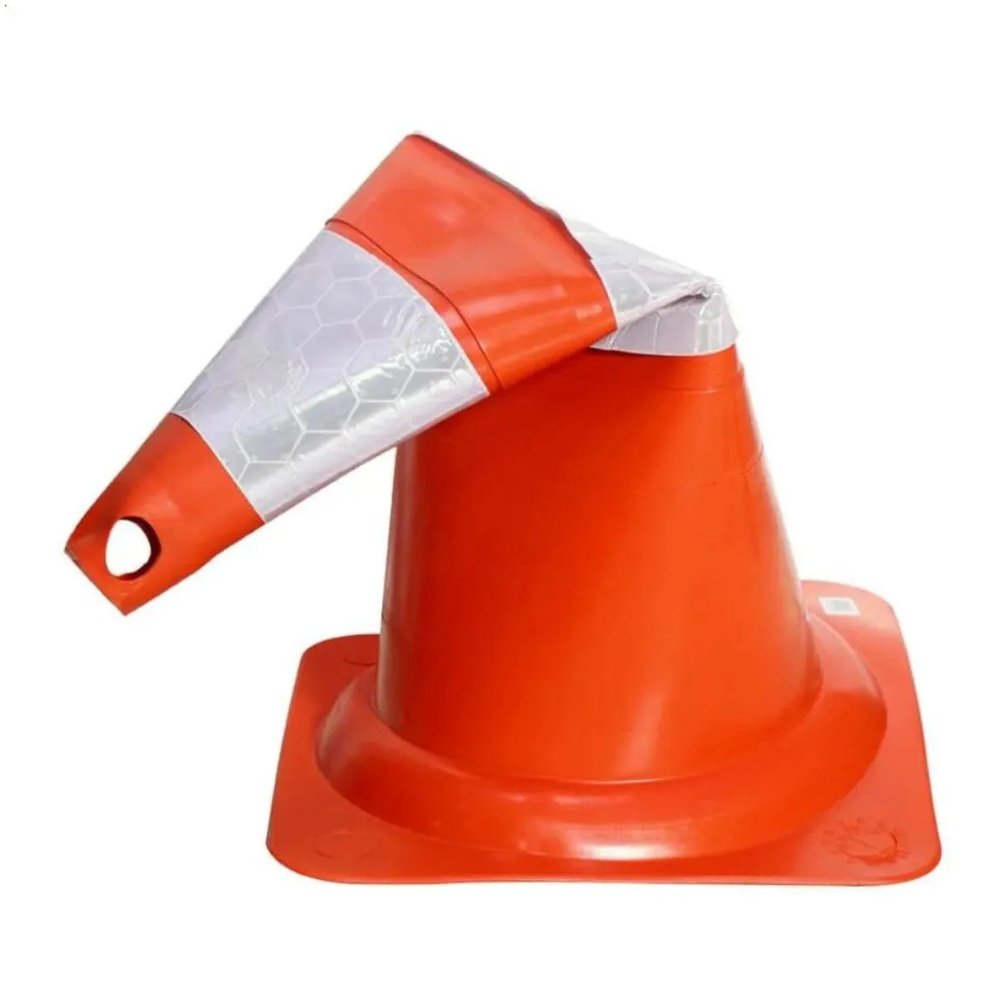 Cone de Sinalização Flexível Laranja/ Branco com faixa Refletiva Auto Adesiva: é utilizado para sinalização de trânsito, estacionamentos, obras, práticas esportivas e etc. O Cone Flexível possui duas faixas refletivas nas cores branca. Faixa refletiva: faixas na cor branca no cone laranja.