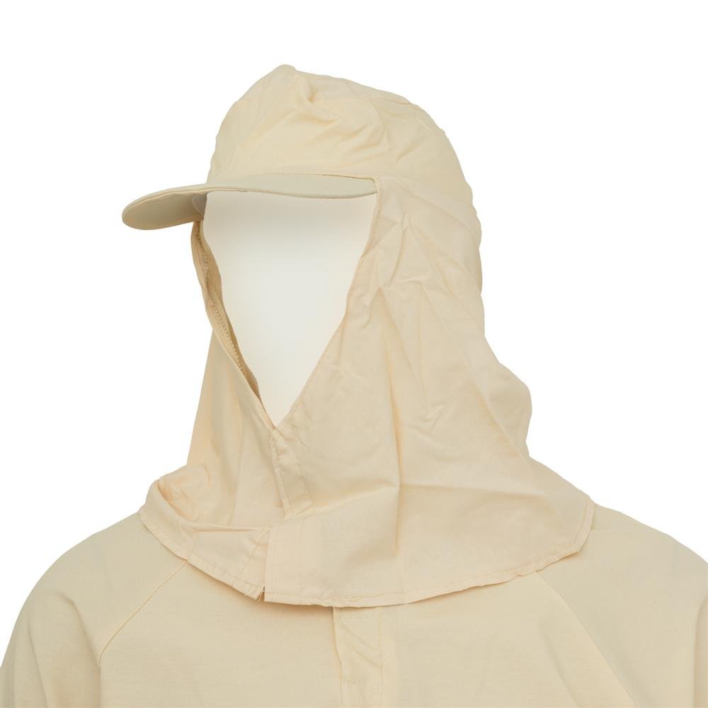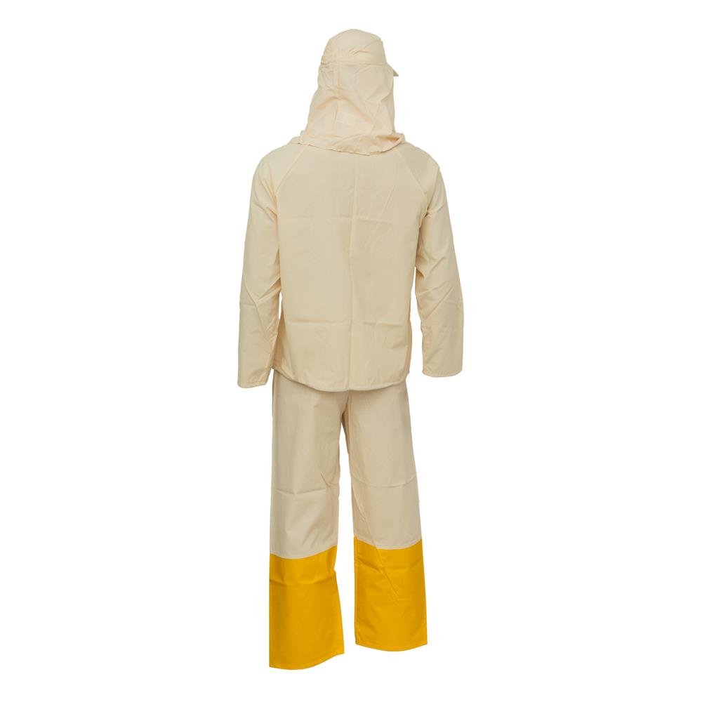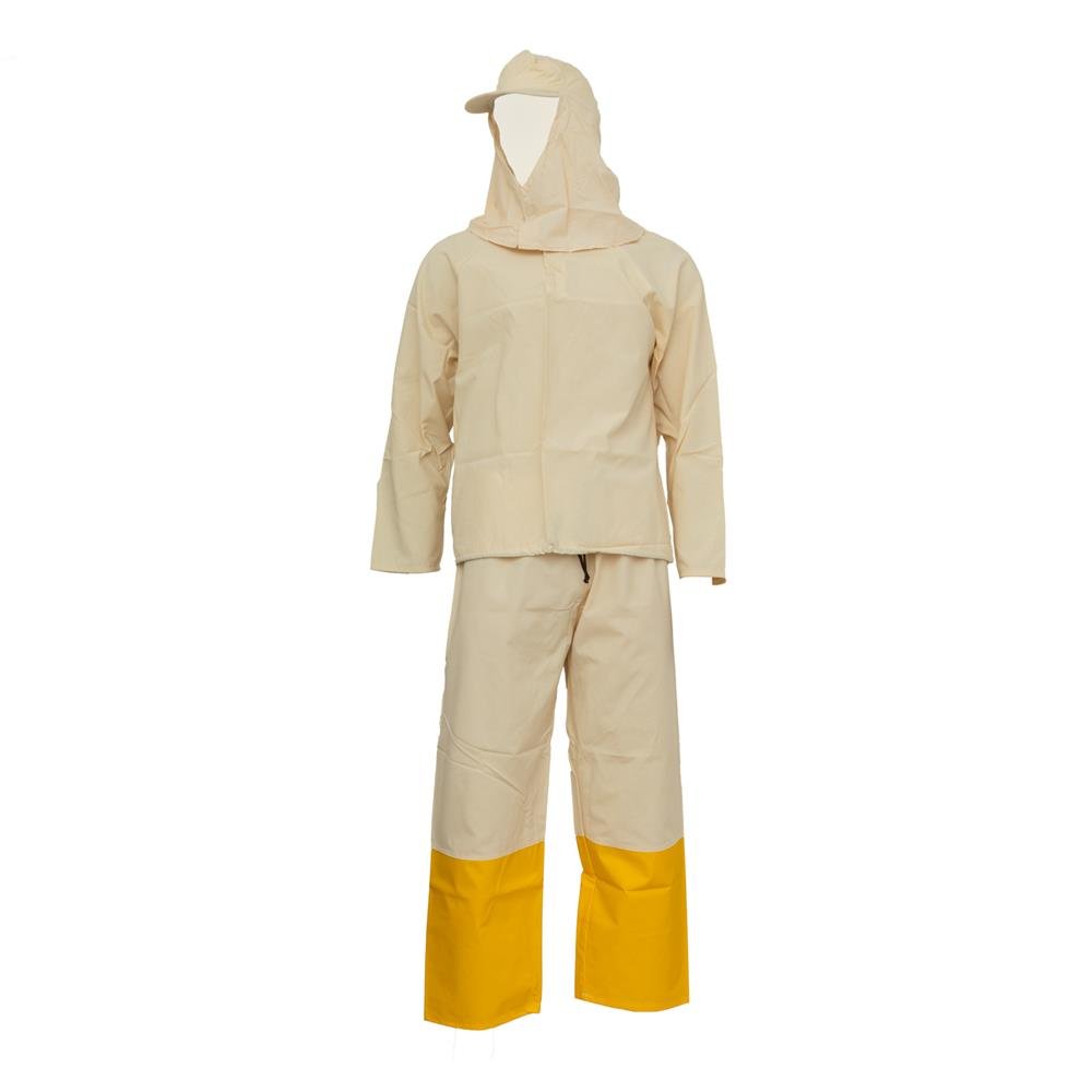 CONJUNTO AGROSILVER 30 LAVADAS CA: 29709/30123 Conjunto Agrosilver 30 Lavadas, composto por blusão, calça, avental PVC e boné árabe, vestimenta confeccionados em cretone com tratamento hidrorepelente, blusão com mangas longas do tipo raglan, com fechamento no pescoço em velcro e calça com reforço PVC até o joelho. Aprovado para: PROTEÇÃO DO TRONCO E MEMBROS SUPERIORES e DAS PERNAS CONTRA RISCOS DE ORIGEM QUÍMICA (AGROTÓXICOS). O EPI, após um ciclo de 30 lavagens manuais recomendadas pelo fabricante, obteve o nível de proteção "C2"para a ISO 27065:2017. Cores: Bege e reforço amarelo.