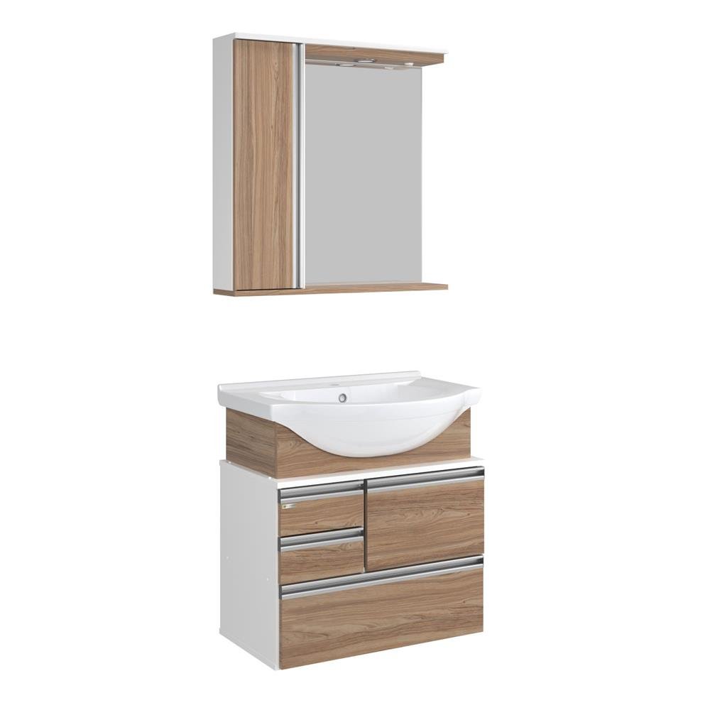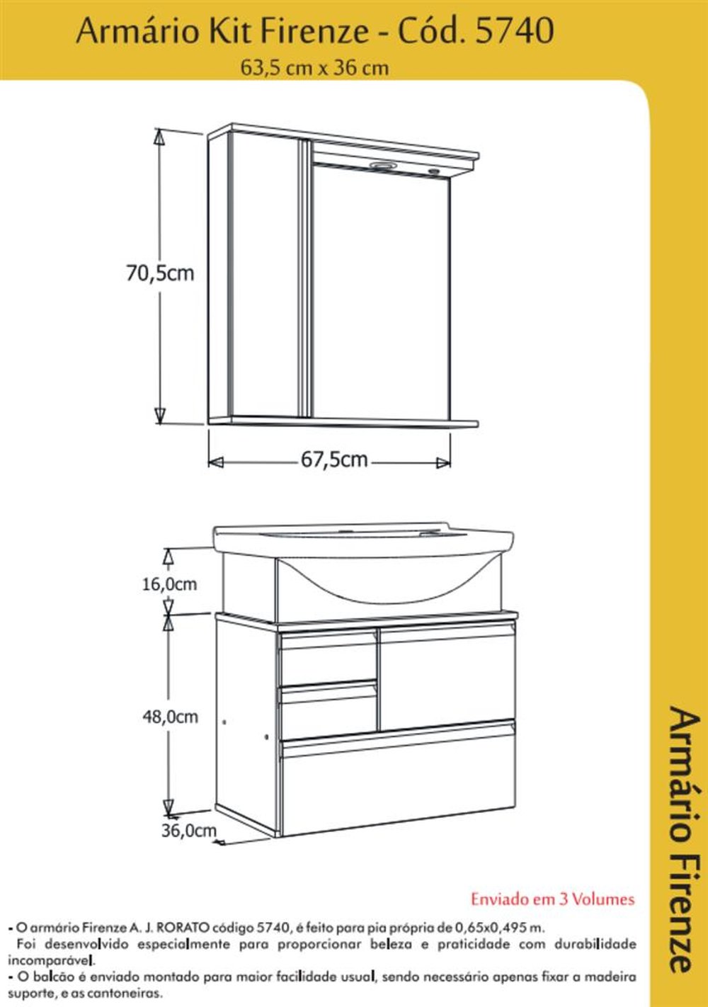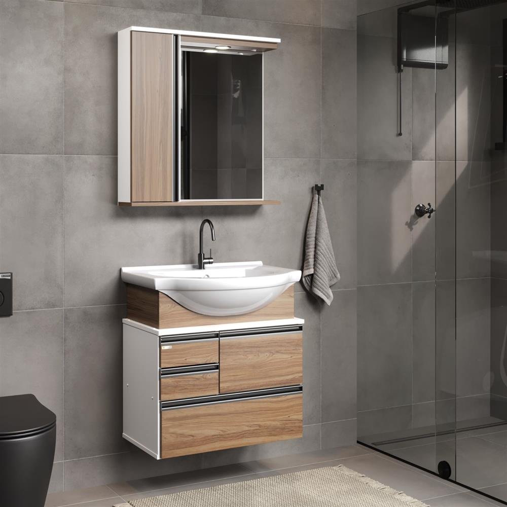 Conjunto De Banheiro Firenze, Aj Rorato, Suspenso, Cor Nogal, 63,5Cm (1 Espelheira, 1 Pia Mármore Sintético, 1 Armário)