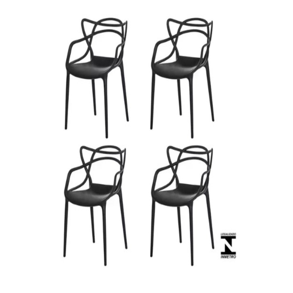 Mesa Redonda Eiffel 1,0m de diâmetro Branca 4 Cadeiras DS400 Masters Allegra Pretas Cadeira 100% polipropileno, certificada pelo INMETRO, lavável, empilhável e com proteção UV.