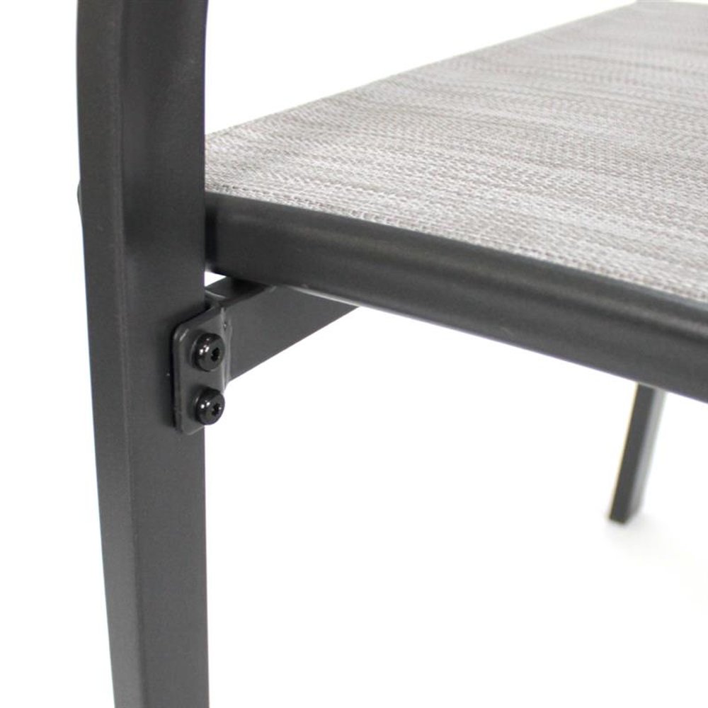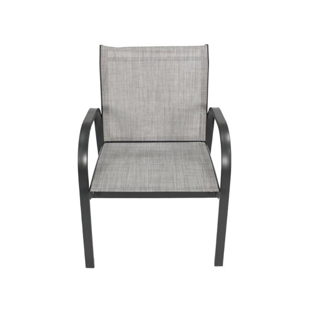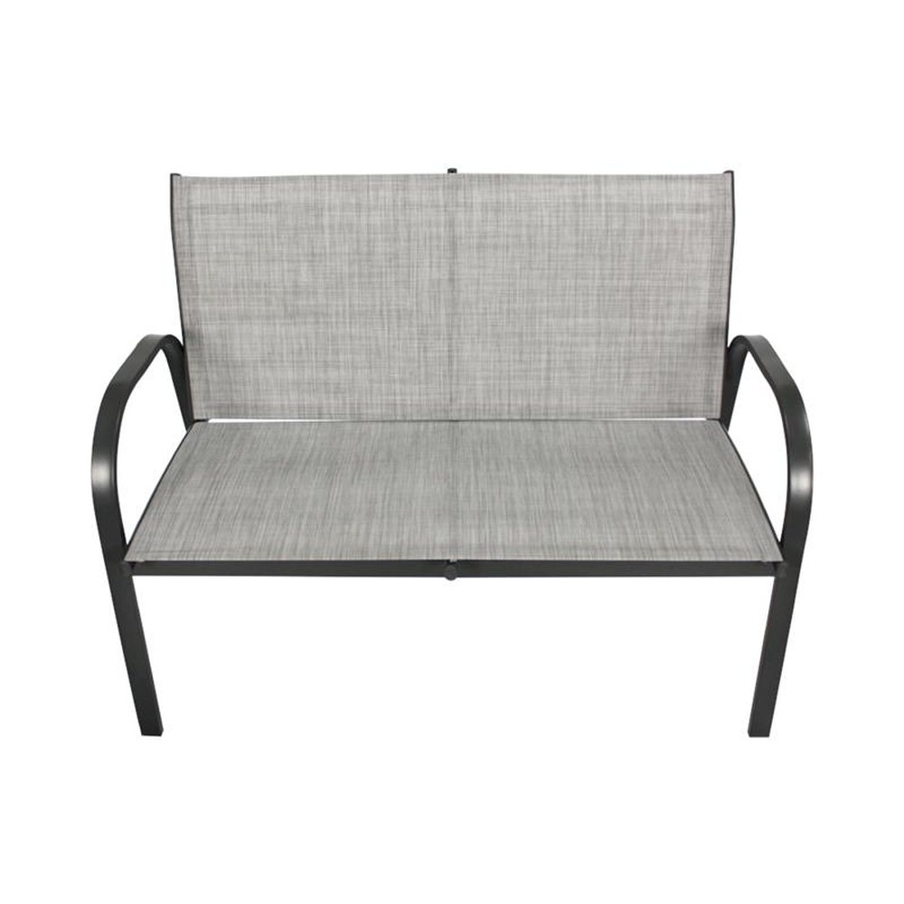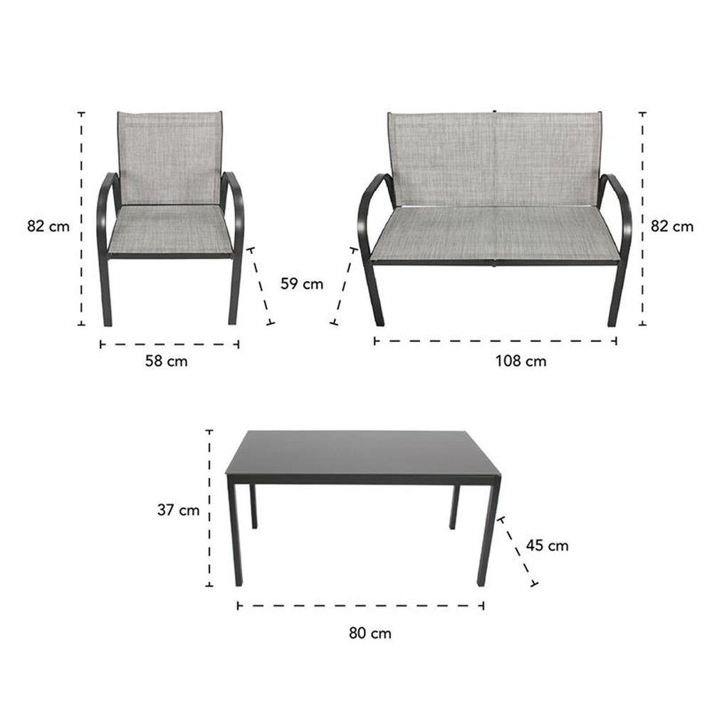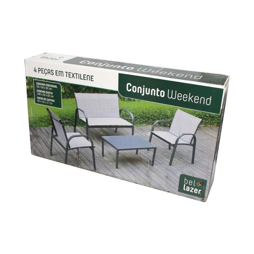 Conjunto Weekend Composto por 4 peças: 2 cadeiras individuais com estrutura de aço e assento/encosto em textilene; 1 cadeira dupla com estrutura de aço e assento/encosto em textilene; 1 mesa de centro com estrutura de aço e vidro temperado