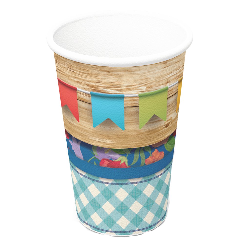 Embalagem com 12 pacotes. Cada pacote contendo 08 copos de 200ml. Copos em papel certificado e produto biodegradável.