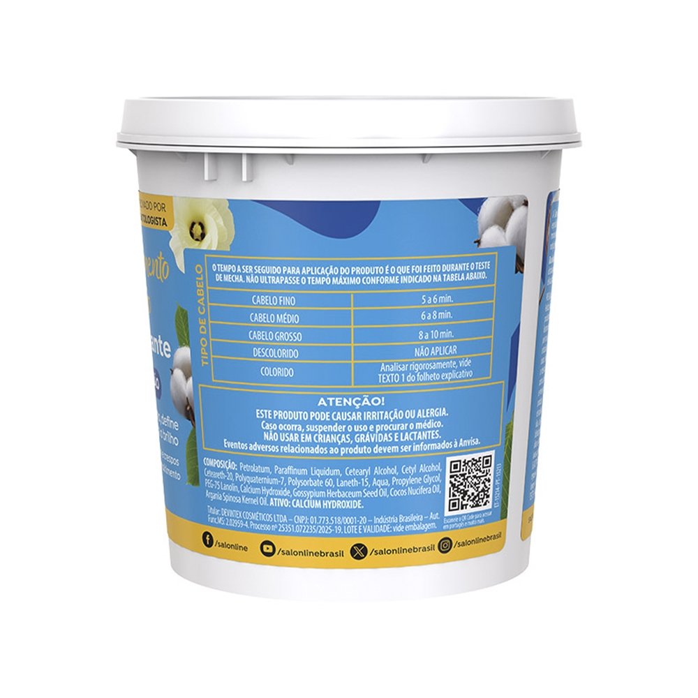 Teste de mecha: importante para verificar o tempo de ação ideal e as condições dos fios para o relaxamento. Preparação: Antes de iniciar, divida o cabelo em 4 partes. Aplique Keratin Hair Food Salon Line no pescoço, orelhas, contorno do rosto, linha do cabelo e couro cabeludo. Em caso de retoque, aplique também no comprimento. Coloque as luvas. Preparo da mistura: Não utilize materiais metálicos. Use somente utensílios plásticos (pente e espátula). Aplicação: Comece pela parte de trás, mecha a mecha, aplicando generosamente com um pincel. Cubra todo o cabelo rapidamente para assegurar cobertura uniforme. Utilize a palma das mãos para suavizar a aplicação, sempre no sentido dos fios. Em cabelos virgens, enluve gentilmente com 0,5 cm de distância da raiz. Não puxe ou estique os fios. Nos minutos finais, massageie para garantir uma distribuição homogênea. Enxágue e neutralização: Enxágue iniciando pela parte de trás, com água morna ou em temperatura ambiente. Aplique o Neutralizing Shampoo Salon Line, indispensável para a remoção total dos resíduos. Condicionamento e finalização: Aplique um condicionador Salon Line, distribua, deixe agir por 5 minutos, enxágue e finalize como desejar. Dicas de uso: Use luvas durante todo o processo. Não lave os cabelos por pelo menos 3 dias antes do procedimento. Salon Line recomenda: Em caso de dúvidas, consulte um profissional ou entre em contato com o SAC. Os Cremes Relaxantes são compatíveis com Guanidina, Hidróxido de sódio e Lithium, e incompatível com Tioglicolato de Amônia. Não é compatível com cabelos coloridos e descoloridos.