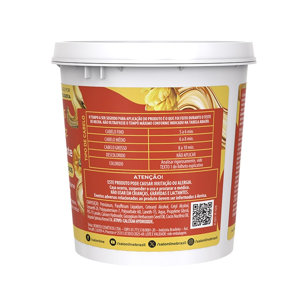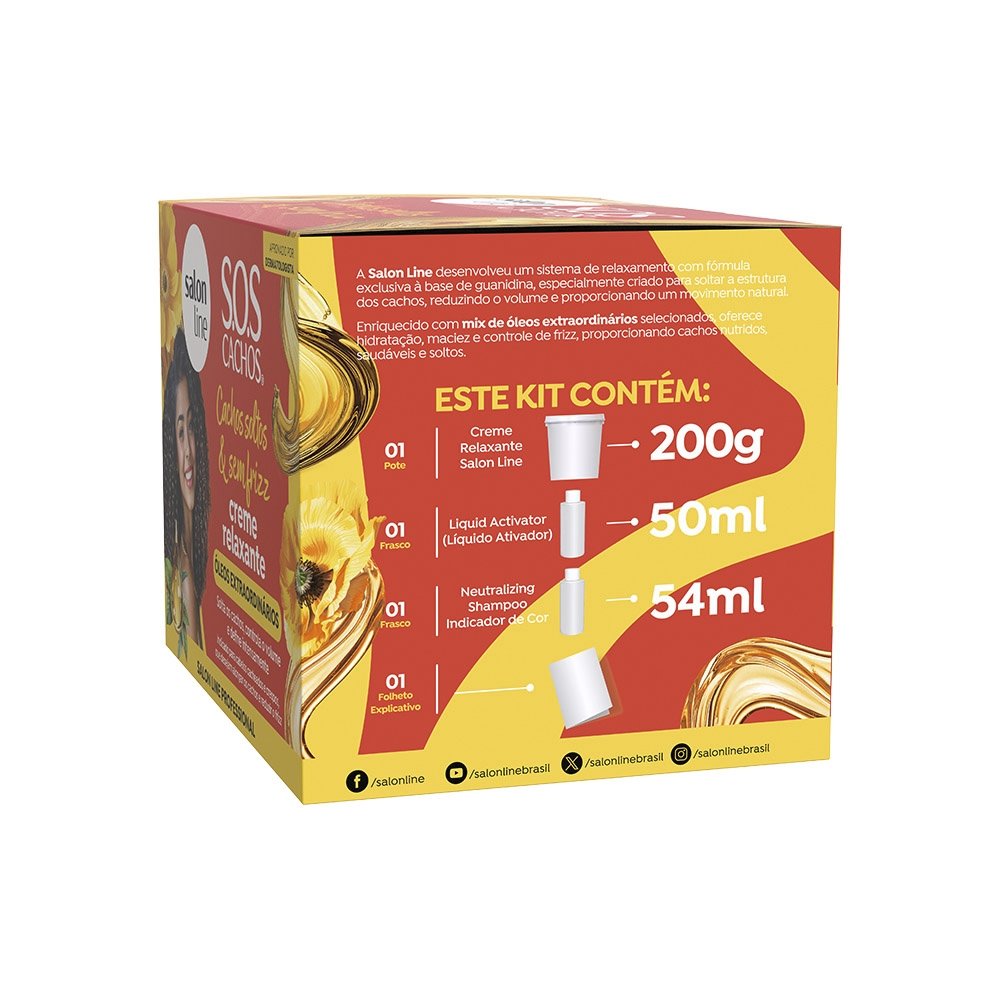 Preparo da mistura: Não utilize materiais metálicos. Use somente utensílios plásticos (pente e espátula). Aplicação: Comece pela parte de trás, mecha a mecha, aplicando generosamente com um pincel. Cubra todo o cabelo rapidamente para assegurar cobertura uniforme. Utilize a palma das mãos para suavizar a aplicação, sempre no sentido dos fios. Em cabelos virgens, enluve gentilmente com 0,5 cm de distância da raiz. Não puxe ou estique os fios. Nos minutos finais, massageie para garantir uma distribuição homogênea. Enxágue e neutralização Enxágue iniciando pela parte de trás, com água morna ou em temperatura ambiente. Aplique o Neutralizing Shampoo Salon Line, indispensável para a remoção total dos resíduos. Condicionamento e finalização Aplique um condicionador Salon Line, distribua, deixe agir por 5 minutos, enxágue e finalize como desejar. Dicas de uso: Use luvas durante todo o processo. Não lave os cabelos por pelo menos 3 dias antes do procedimento. Salon Line recomenda: Em caso de dúvidas, consulte um profissional ou entre em contato com o SAC. Os Cremes Relaxantes são compatíveis com Guanidina, Hidróxido de Sódio e Lithium, e incompatível com Tioglicolato de Amônia. Não é compatível com cabelos coloridos e descoloridos.