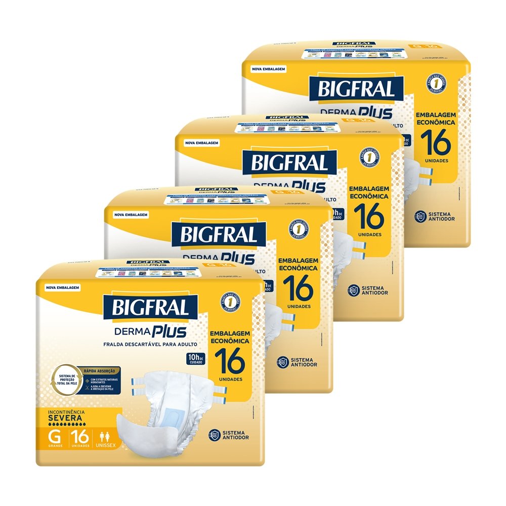 Fralda Geriátrica Bigfral Derma Plus Tamanho G - 4 Pacotes com 16 Fraldas - Total 64 Tiras