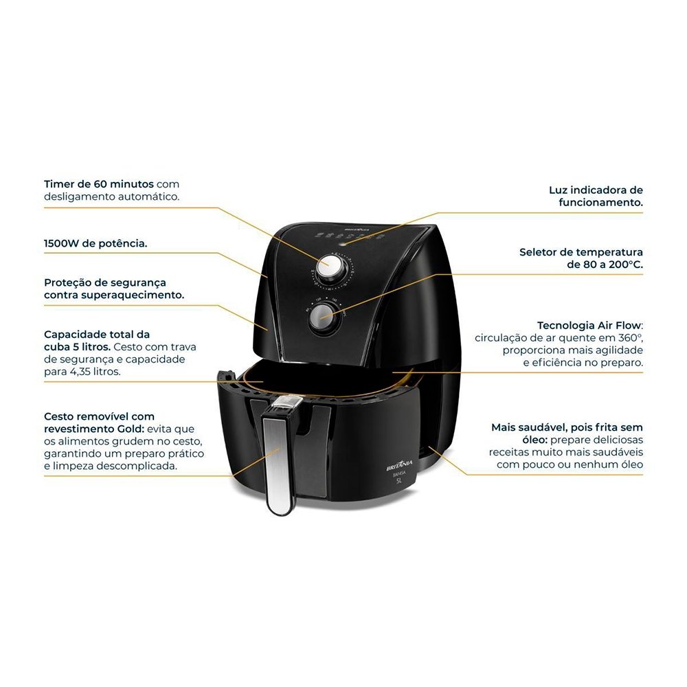 Fritadeira Air Fryer Britânia BAF45A - 1500W, 5 Litros, Preto com Revestimento Gold, 110V