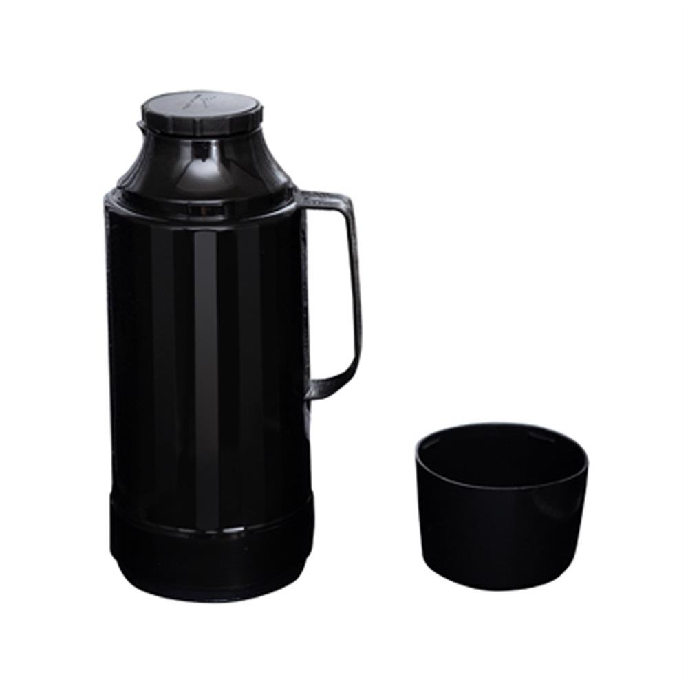 garrafa termica lille na cor preta corpo canelado 1 litro, p ossui copo e rolha com grande eficiencia termica.