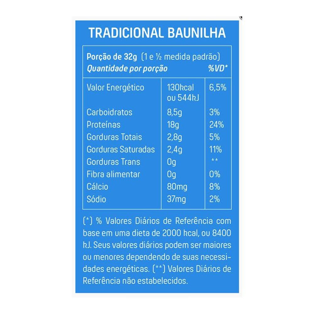 Ingredientes: Proteína Concentrada do Soro do Leite, Maltodextrina, Triglicerídeos de Cadeia Média, Aromatizante Idêntico ao Natural de Baunilha, Goma Xantana, Adoçante Sucralose.