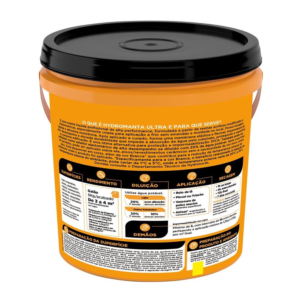 Impermeabilizante Hydromanta Líquida Ultra Hydronorth, é uma manta líquida profissional de alta performance, formulado a partir de resinas acrílicas, especialmente criada para aplicação a frio sem emendas e moldada no local, possui secagem ultrarrápida e altíssima resistência. Após aplicado e curado forma uma membrana elástica e flexível impermeável de alto desempenho e elevada durabilidade, é uma excelente alternativa para proteção e impermeabilização, resistente às intempéries, dispensa proteção contra raios solares (na cor branca) e ainda reflete os mesmos reduzindo a temperatura da estrutura, além de dispensar proteção mecânica para áreas com trânsito eventual de pessoas. Indicação de Aplicação: É uma excelente alternativa para proteção e impermeabilização de: telhados variados (cerâmica, cimento ou galvanizados), lajes expostas, abóbadas, sheds, cúpulas, marquises, calhas de concreto, sacadas, varandas, terraços e outras áreas (consultar departamento técnico). APLICAÇÃO: