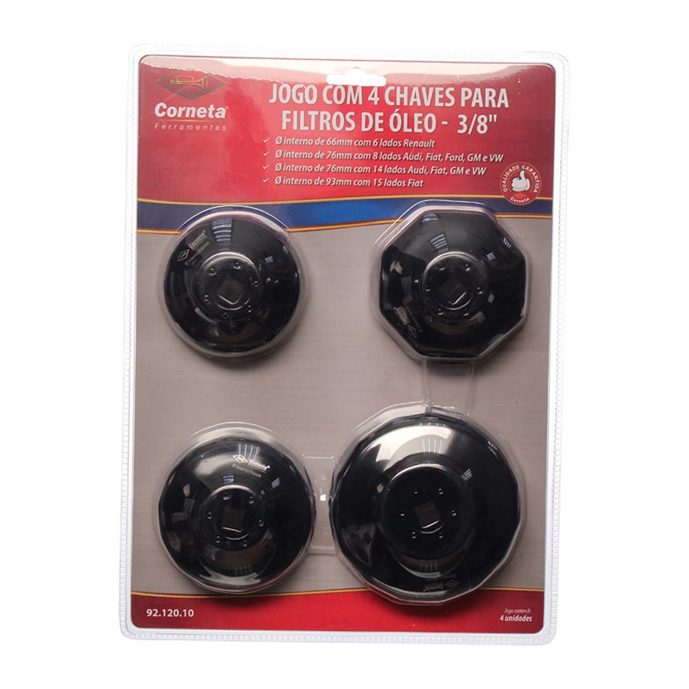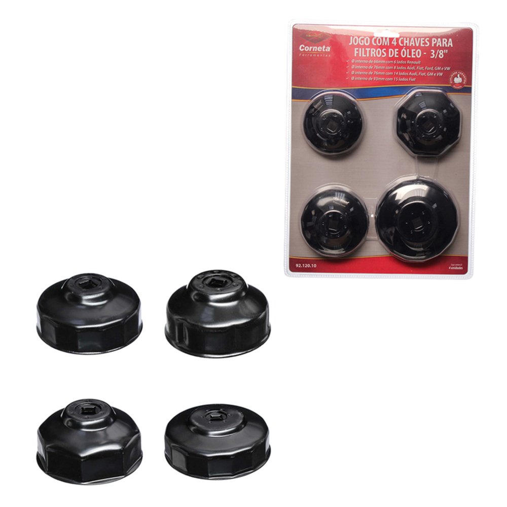JOGO 4 CHAVES PARA FILTRO DE ÓLEO 3/8" - Dimensões da Peça: ¿ 1 PC - Ø interno de 66mm com 6 lados Renaut: 7 x 7 x 4cm ¿ 1 PC - Ø interno de 76mm com 8 lados Audi, Fiat, Ford, GM e VW: 8 x 8 x 4,5cm ¿ 1 PC - Ø interno de 76mm com 14 lados Audi, Fiat, GM e VW: 8 x 8 x 4cm ¿ 1 PC - Ø interno de 93mm com 15 lados Fial: 9,8 x 9,8 x 3,5cm - Dimensões da Embalagem: 22,5 x 5 x 30,5cm - Quantidade Inner: 6 Peças - Dimensões Inner: 31 x 23 x 23cm - Quantidade Master: 24 Peças - Dimensões Master: 52 x 48 x 33cm - Material: Aço Carbono - Cor: Preto - Tipo de Embalagem: Blister - Marca: Corneta Ferramentas - Origem: Fabricado na China sob supervisão técnica Corneta Ferramentas - Contém: 4 unidades ¿ 1 PC - Ø interno de 66mm com 6 lados Renaut ¿ 1 PC - Ø interno de 76mm com 8 lados Audi, Fiat, Ford, GM e VW ¿ 1 PC - Ø interno de 76mm com 14 lados Audi, Fiat, GM e VW ¿ 1 PC - Ø interno de 93mm com 15 lados Fial - Características: ¿ Acabamento oxidado negro para maior proteção contra ferrugem. - Antes do uso: ¿ Verificar se o produto está em perfeitas condições de uso. - Cuidados: ¿ Utilize equipamento de proteção individual (óculos de proteção, botas etc.) necessário ao trabalho; ¿ Mantenha o produto sempre seco e longe de umidade; ¿ Use a ferramenta correta para cada tipo de trabalho. Não force a ferramenta. A ferramenta correta fara o trabalho melhor e mais seguro se utilizada para aquilo que foi projetada; ¿ Guarde em local seguro. - Advertência/Atenção: ¿ Manter fora do alcance das crianças; ¿ Trabalhe seguro. - Indicação: ¿ Indicado para apertar e remover filtros de óleo entre 66mm e 93mm. - Sac Fornecedor: ¿ Sac: 0800 607 1322 ¿ E-mail: posvendas@etilux.com.br ¿ Site: www.etilux.com.br - Garantia: ¿ Em condições normais de uso, este produto tem garantia de 90 dias contra defeitos de material e fabricação, mediante apresentação da nota fiscal de compra. Má conservação, manuseio inadequado, quedas ou quaisquer outras avarias produzidas pelo uso incorreto, a garantia oferecida perde a validade.
