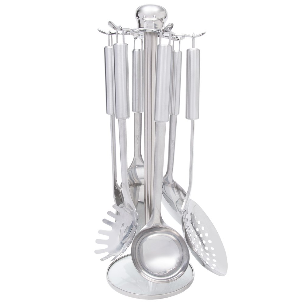 Utensílios feitos em aço inoxidável e um suporte giratório elegante com base de inox e vidro, altamente durável e não solta nenhum resíduo nos alimentos, ideal para suas refeições e um ótimo item decorativo, indispensáveis na preparação de pratos saborosos. O jogo de utensílios Mimo Style em aço inox com acabamento em brilho faz toda a diferença na elaboração de suas receitas. Medidas do Suporte: C-15cm L-15cm A-38cm e pesa 672g. Os cabos dos utensílios foram projetados para proporcionar maior conforto e segurança no manuseio, leves e próprios para uso diário, também possuem alça para poder pendurar no suporte, jogo completo para não faltar nada na sua cozinha. O jogo possui suporte com base giratória e mais 6 itens, 1 pegador de massas; 1 escumadeira; 1 colher de arroz; 1 concha; 1 espátula; 1 garfo trinchante. A altura média dos utensílios é de 30cm. Use apenas sabão ou detergente e uma esponja macia. Outros tipos de produtos, como palha de aço, poderão riscar ou prejudicar o brilho dos talheres. Após a lavagem, enxugue imediatamente os talheres, Os utensílios também podem ir a lava-louças.