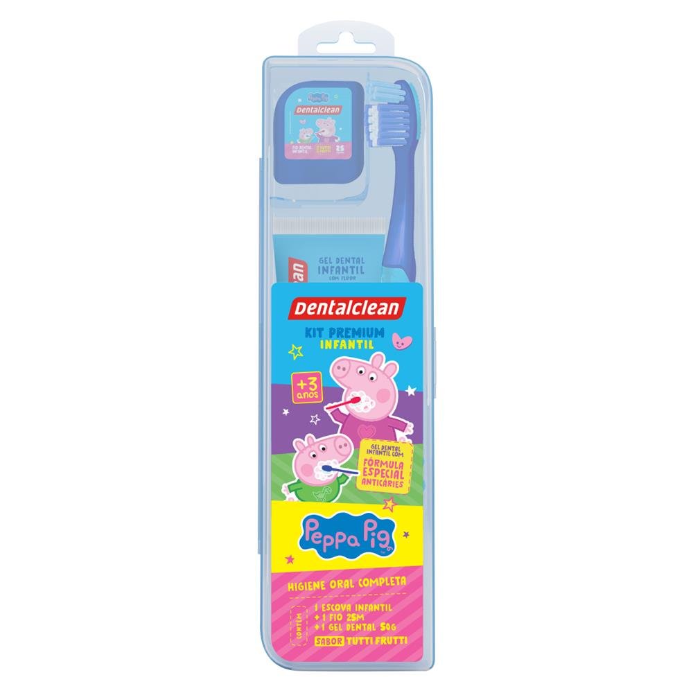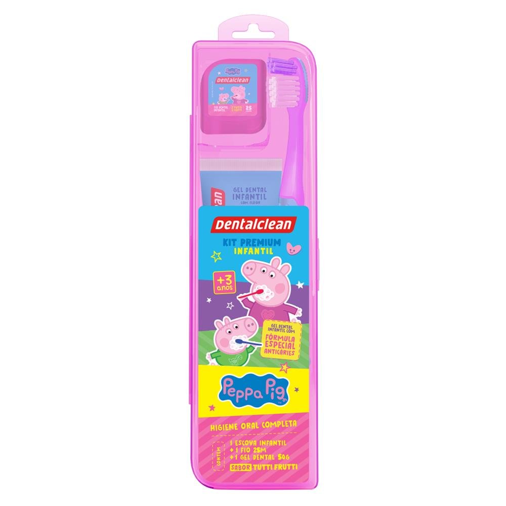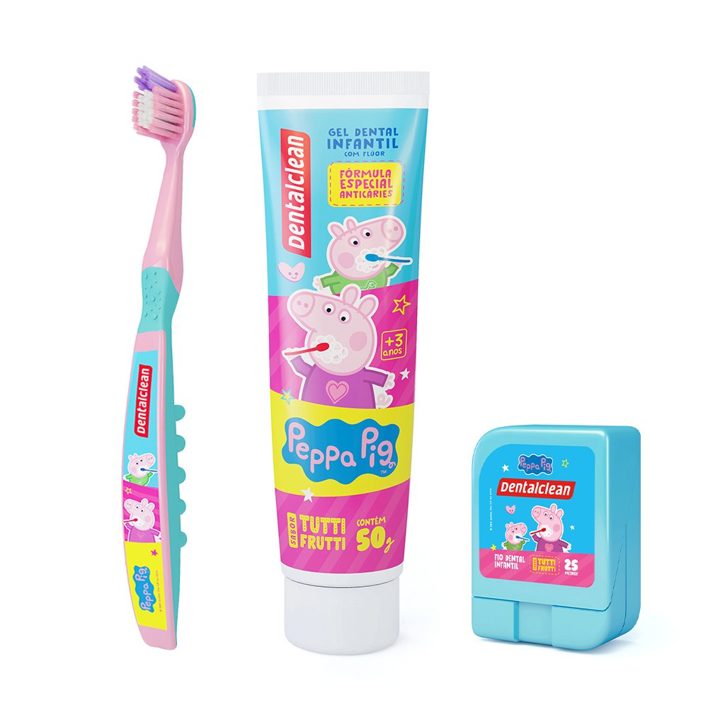 Kit 1 Estojo para Escova Dental + 1 Escova Dental Macia + 1 Fio Dental 20m + 1 Gel Dental Infantil com Flúor Tutti-Frutti 50g Peppa Pig Dentalclean - Sortidas.