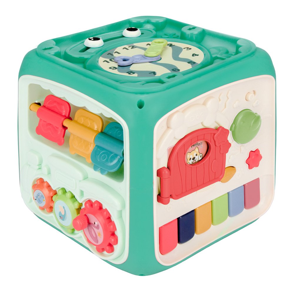 O Cubo Interativo Eletronico Pimpolho e ideal para desenvolver a percepcão tatil, motora, sensorial e logica do seu bebe. Possui 6 lados interativos: -Lado 01: Sons simulando uma bateria ao tocar na tecla grande. -Lado 02: Um teclado musical que emite sons de animais ao apertar as teclas -Lado 03: Possui um volante e uma tecla que simula uma marcha, alem de carrinhos que se movimentam -Lado 04: Possui um telefone de encaixe com teclas numericas que emitem som de telefone ao serem pressionadas. -Lado 05: Possui tres placas giratorias em formato de bichinhos para entreter o seu bebe Lado 06: Em formato de sapo onde o bebe pode movimentar os olhos, possui um relogio com ponteiros ajustaveis para diversão e desenvolvimento. Seu bebe vai aprender e se divertir com o Cubo Interativo Eletronico Caixa 1 unidade na cor verde.