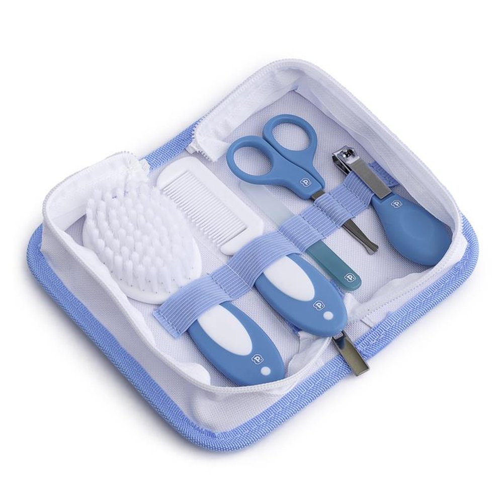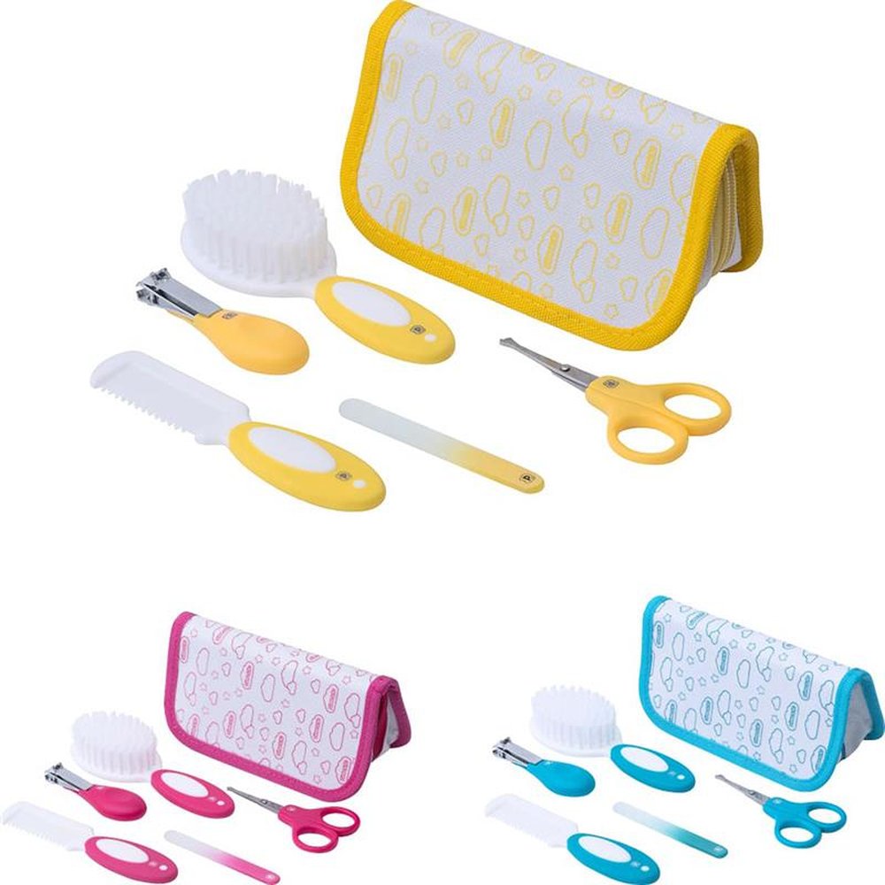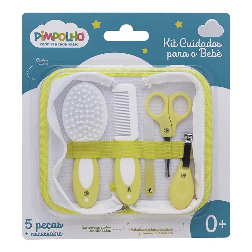 Caixa com 12 Unidades, sendo 4 Rosa, 4 Azul e 4 Amarelo. O kit é composto por uma tesoura infantil de pontas arredondadas, lixa de unha de plástico, cortador de unha em tamanho ideal para o corte das unhas do bebê, pente e escova com cerdas macias e cabo antiderrapante. Vem com necessaire.