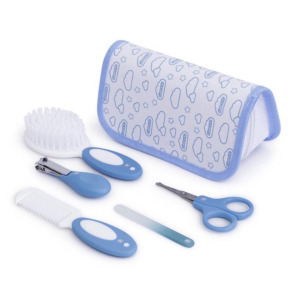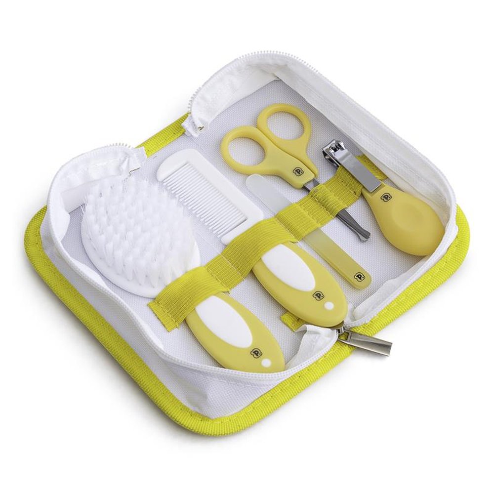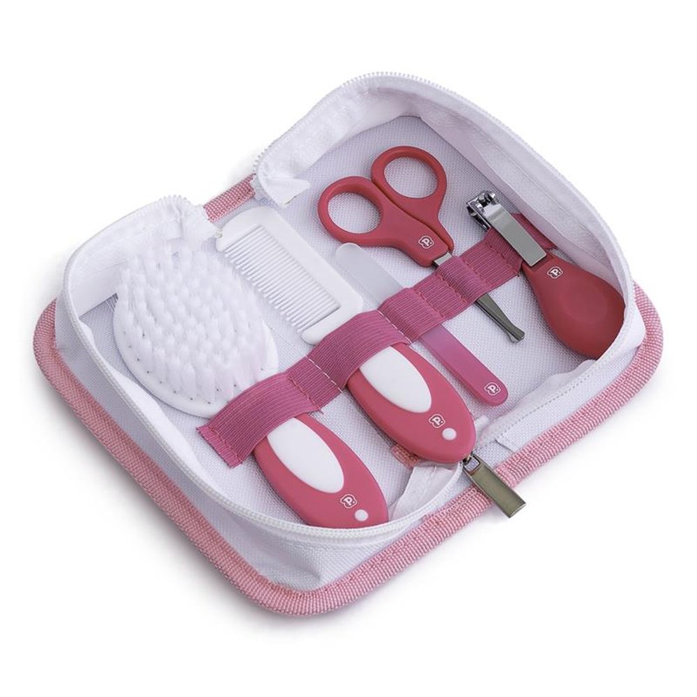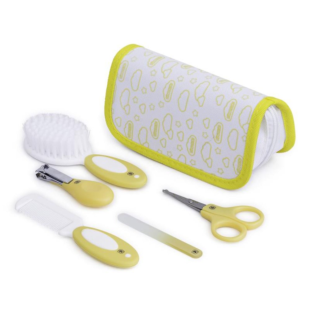 Caixa com 12 Unidades, sendo 4 Rosa, 4 Azul e 4 Amarelo. O kit é composto por uma tesoura infantil de pontas arredondadas, lixa de unha de plástico, cortador de unha em tamanho ideal para o corte das unhas do bebê, pente e escova com cerdas macias e cabo antiderrapante. Vem com necessaire.