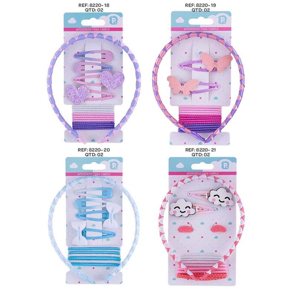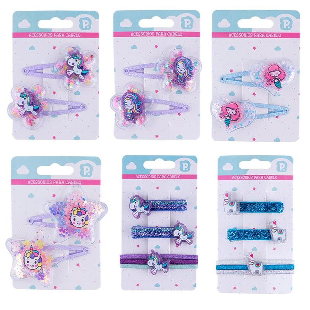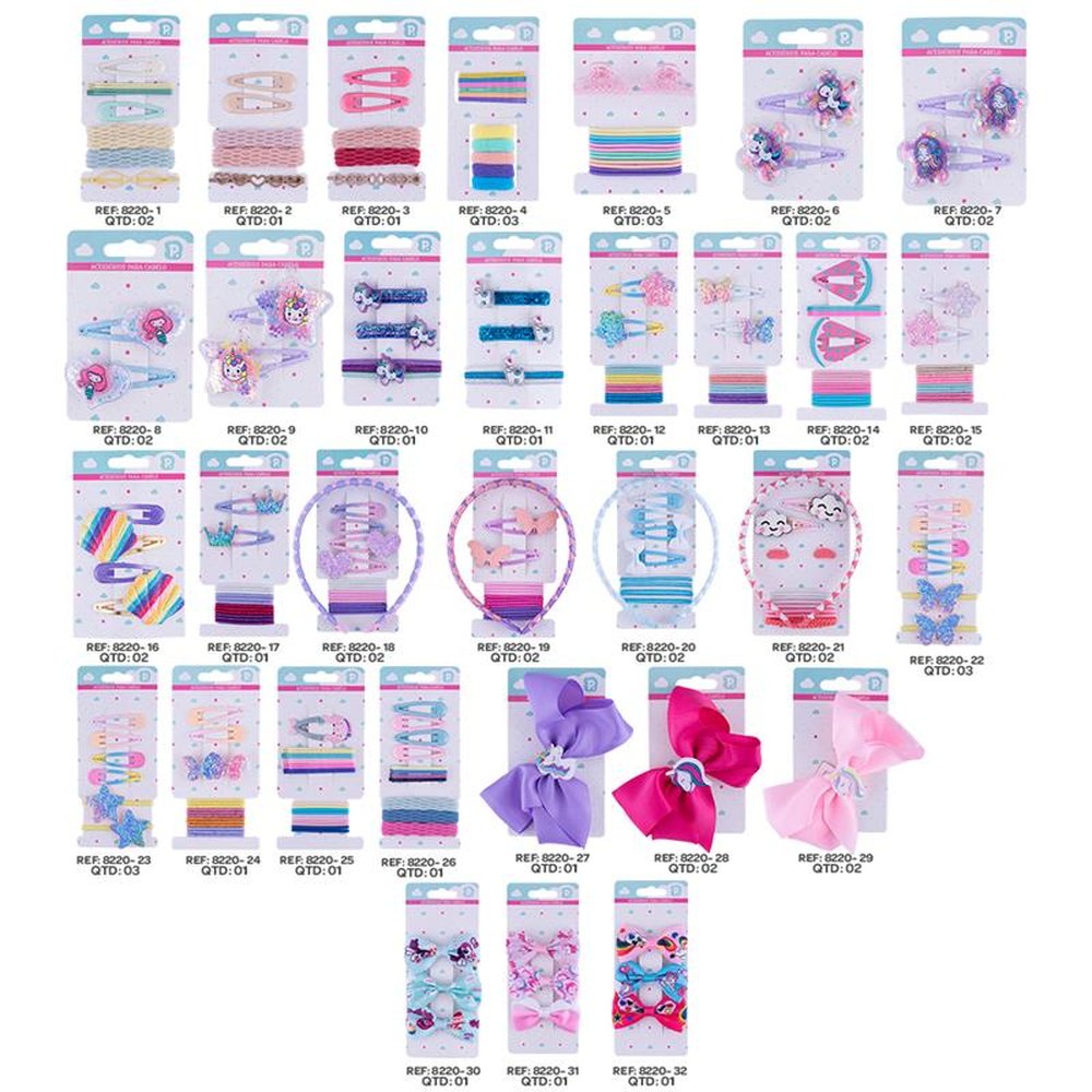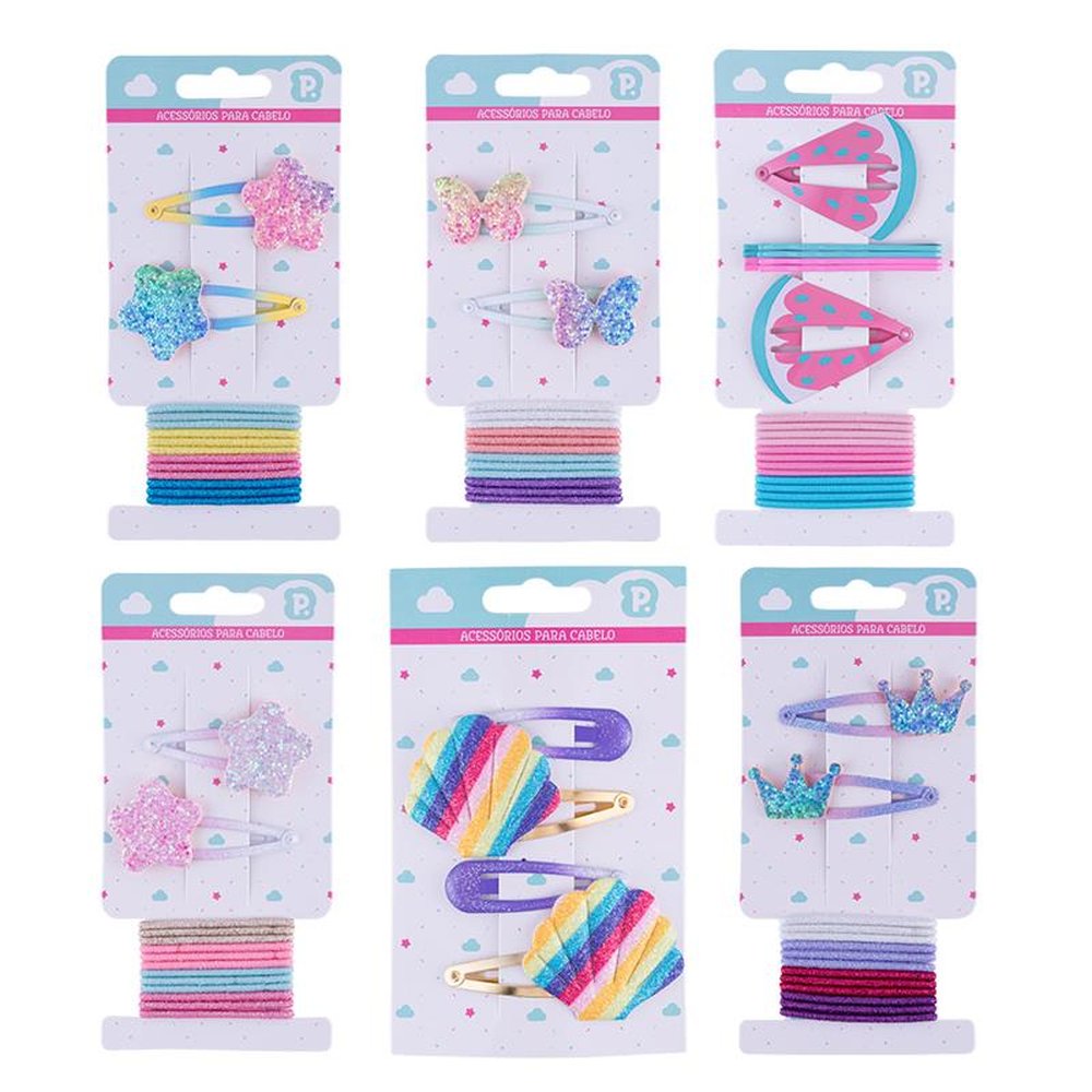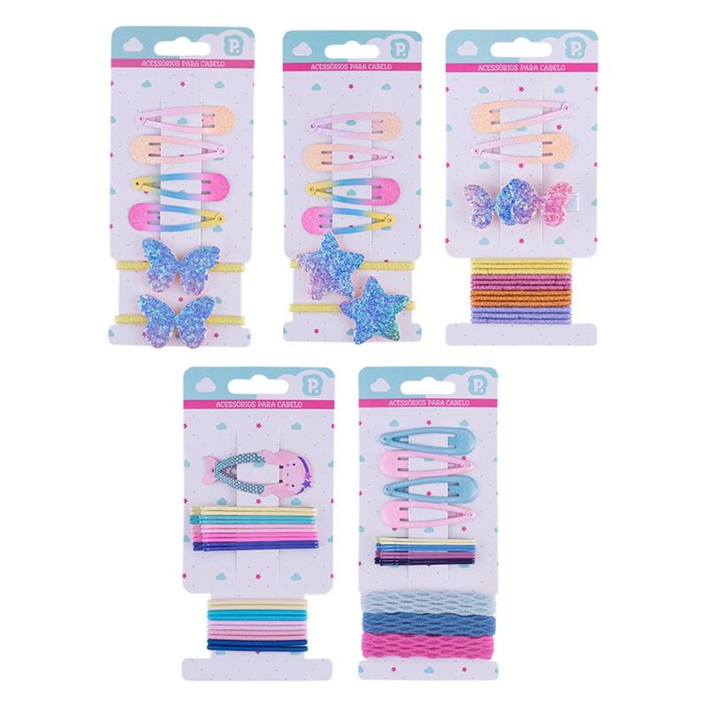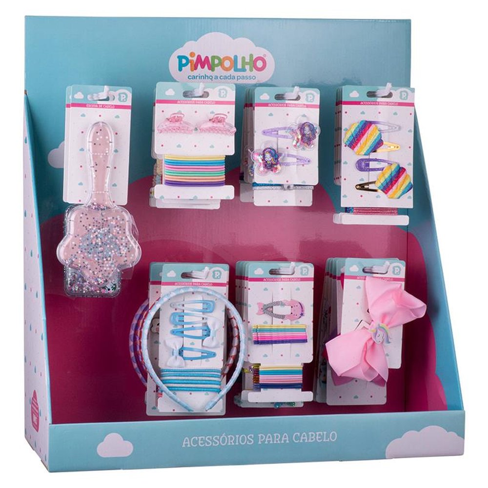 Polibag com 54 kits variados. Kit de acessórios de cabelo Pimpolho. Ideal para criar diversos penteados em qualquer momento do dia. O expositor de balcão para acessórios de cabelo é feito em papel cartão e super fácil de montar. Medidas: Largura: 44cm X Altura: 46,5cm X Profundidade: 20cm.