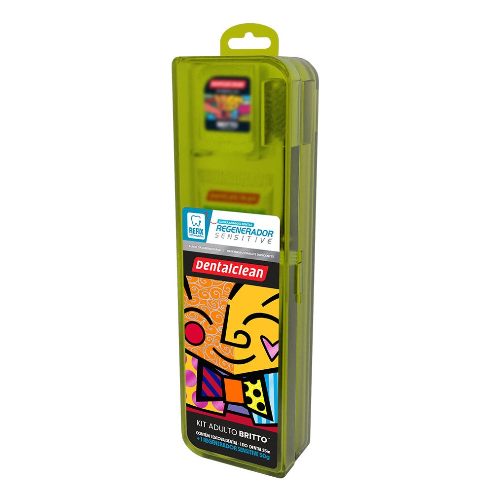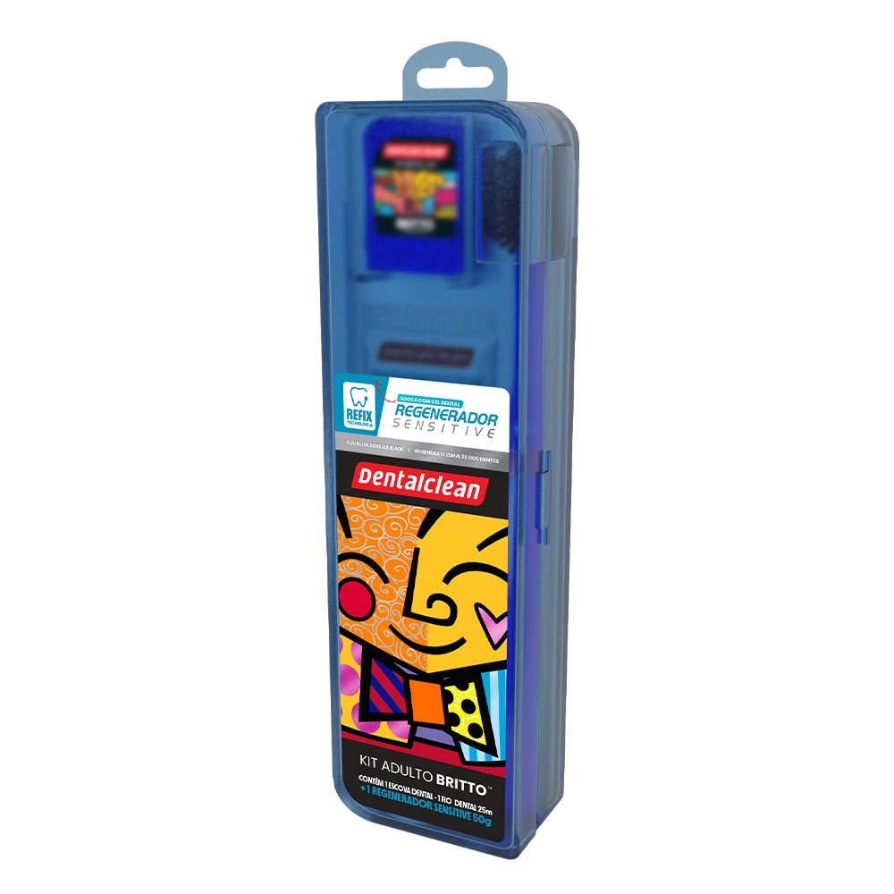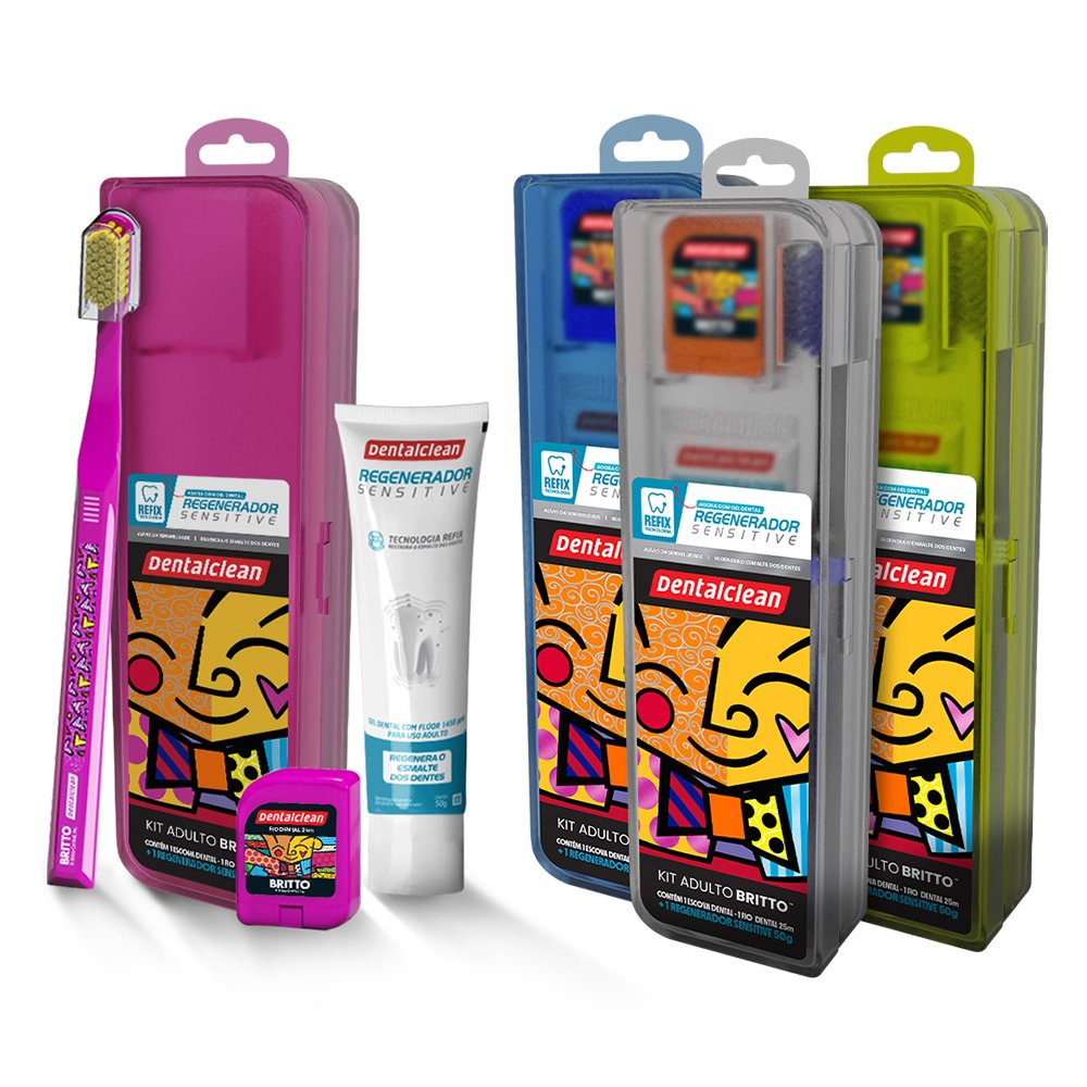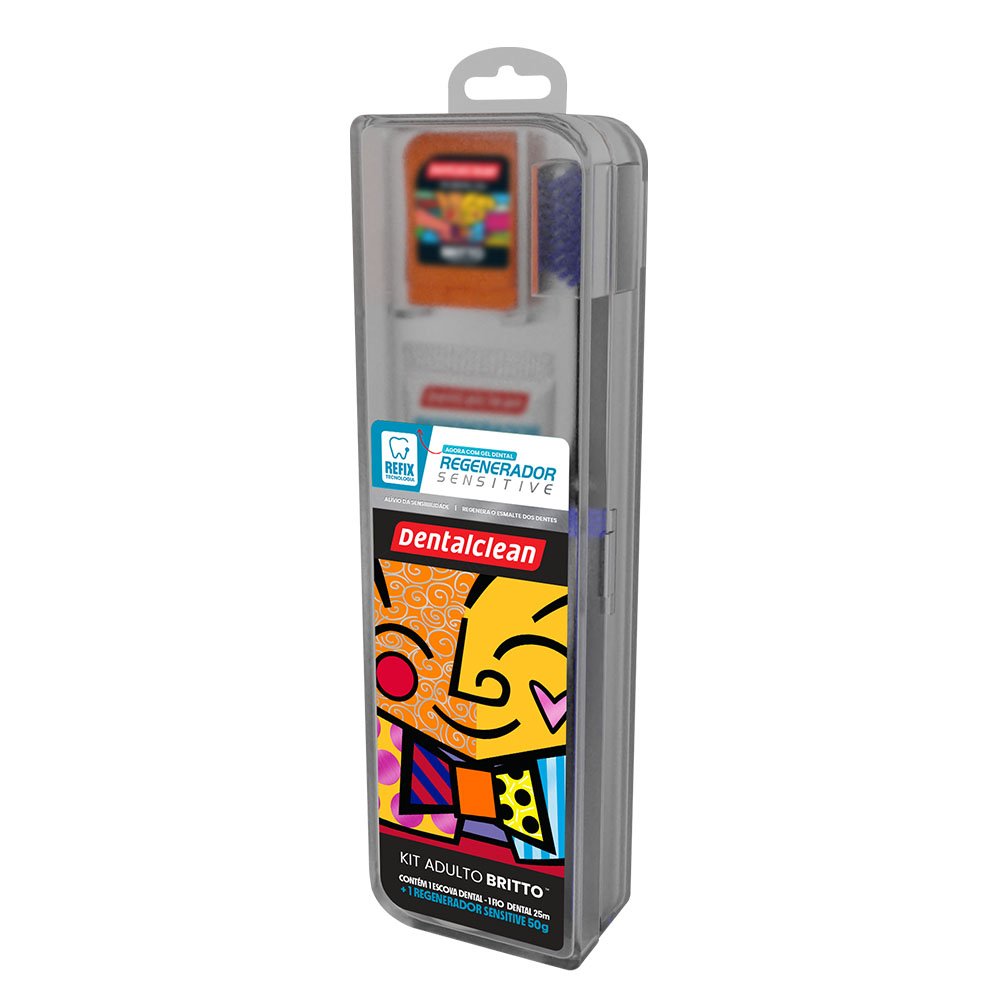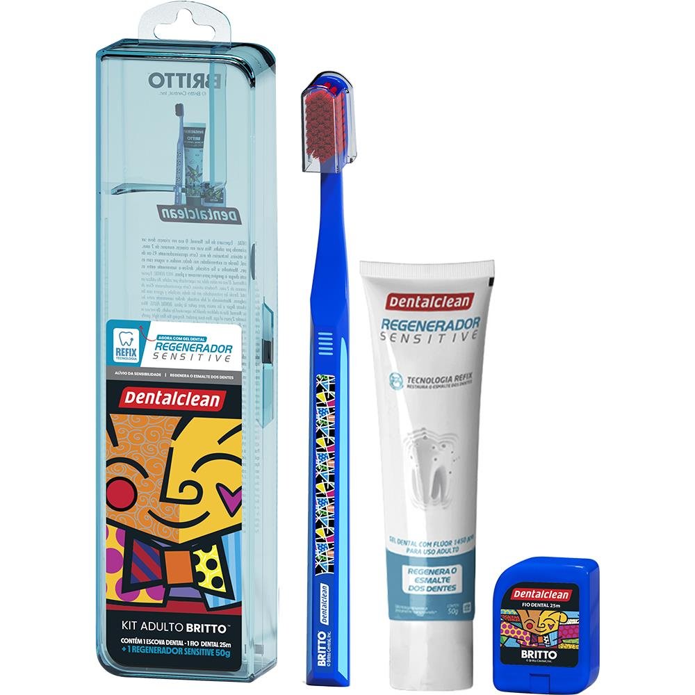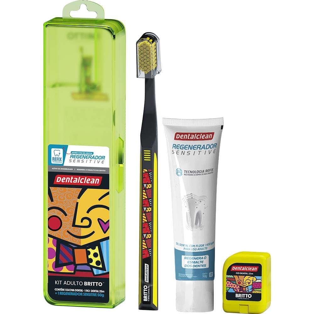 Kit Escova Dental Macia + Fio Dental 20m + Gel Dental Menta 50g Regenerador Sensitive Romero Britto Dentalclean - Cores Sortidas.