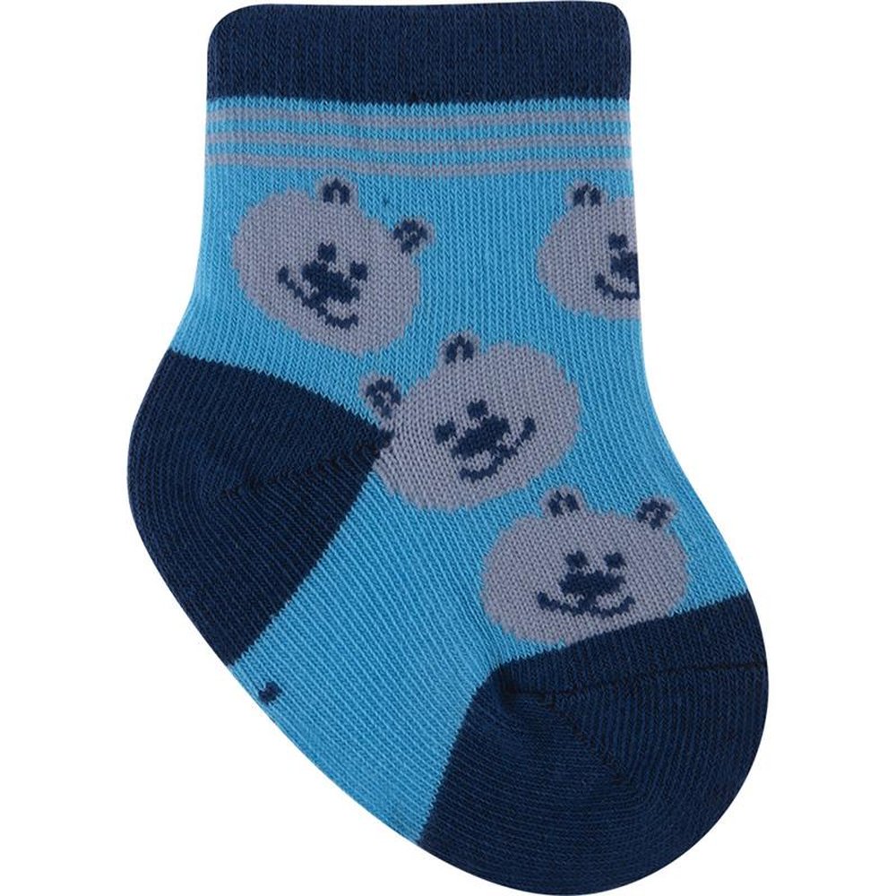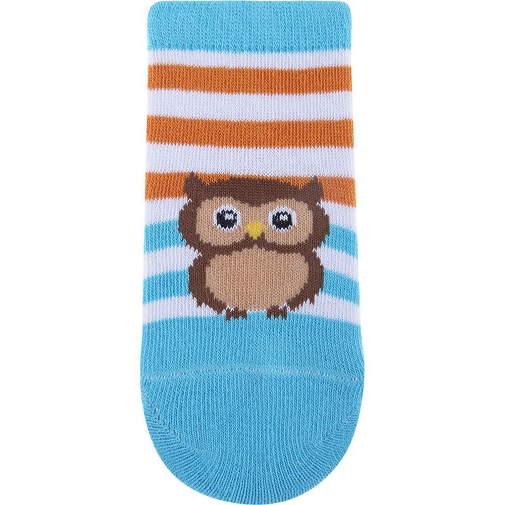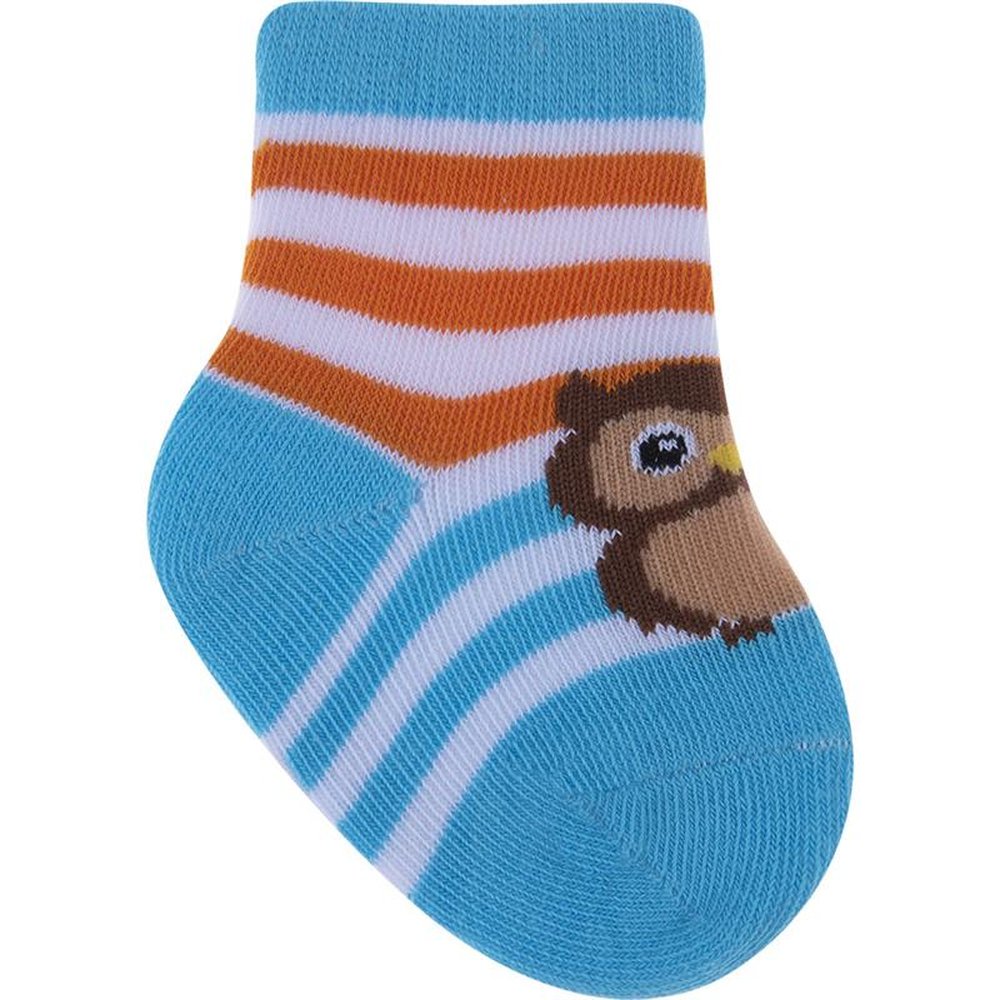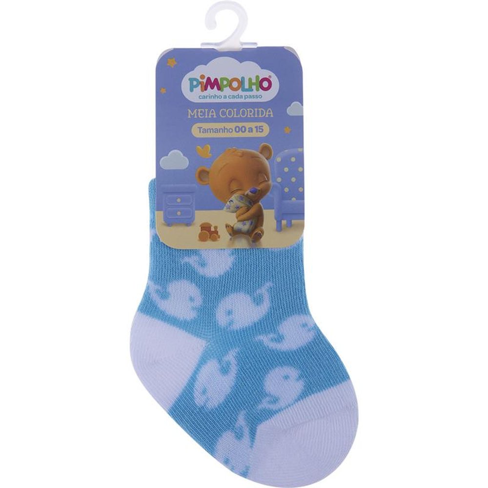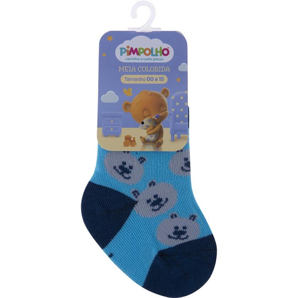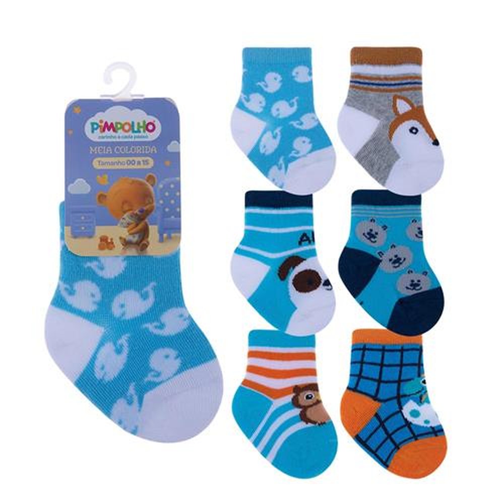Kit com 24 pares, sendo 4 Azul/Baleias, 4 Cinza/Raposa, Azul/Cachorro, 4 Azul/Ursos, 4 Azul/Coruja e 4 Azul/Dinossauro. Meia colorida é confortável com cores e estampas divertidas e variadas.