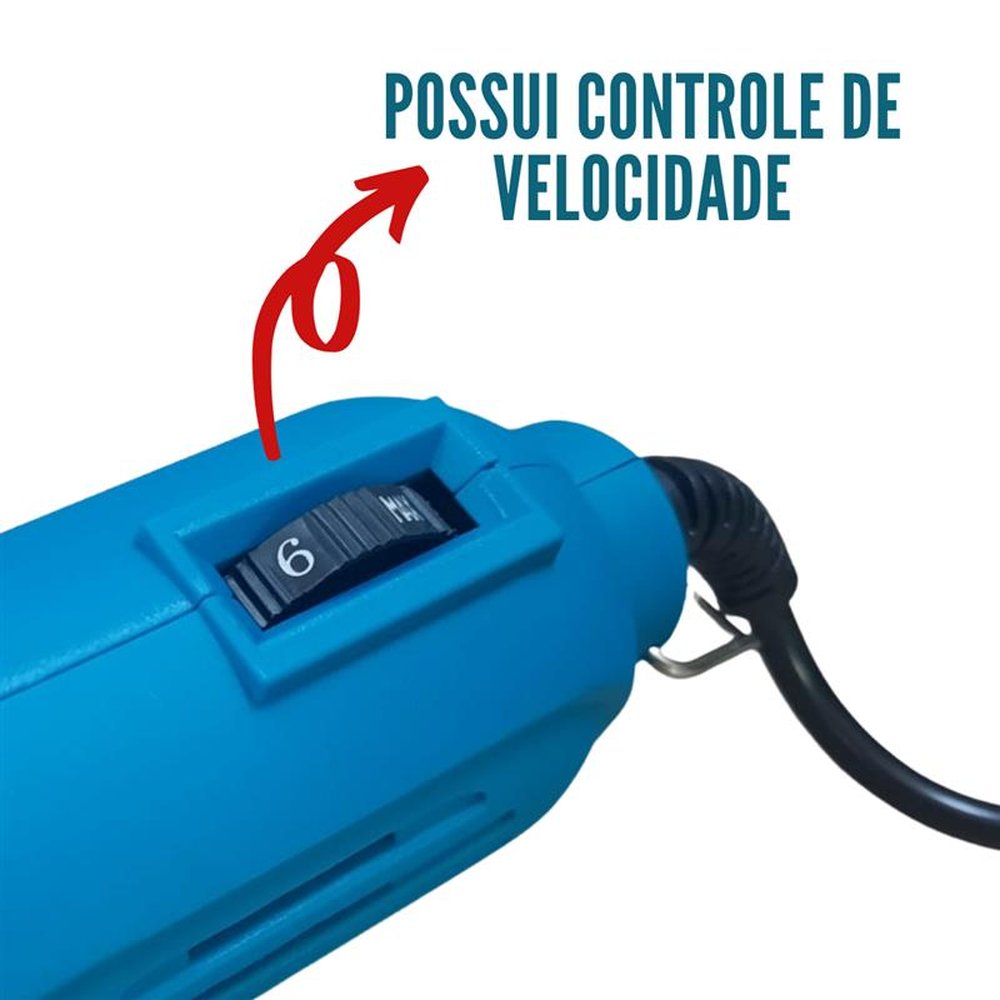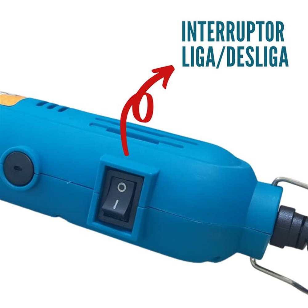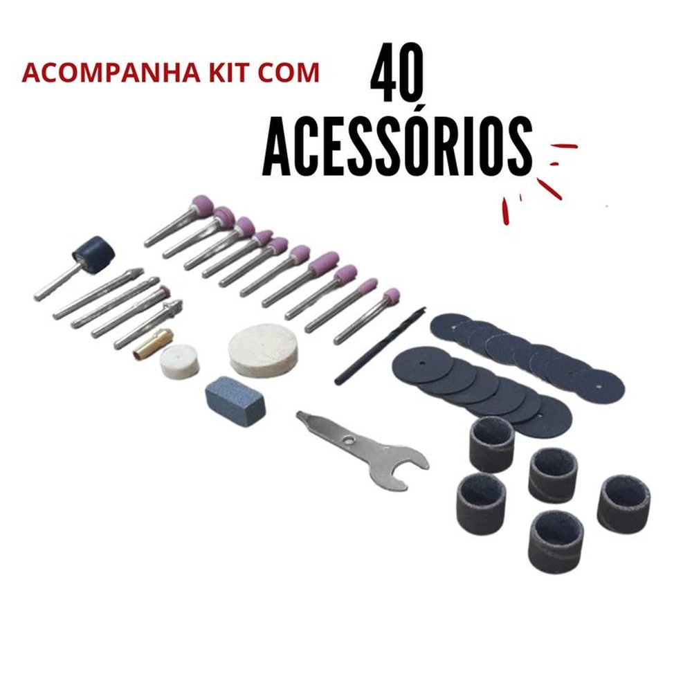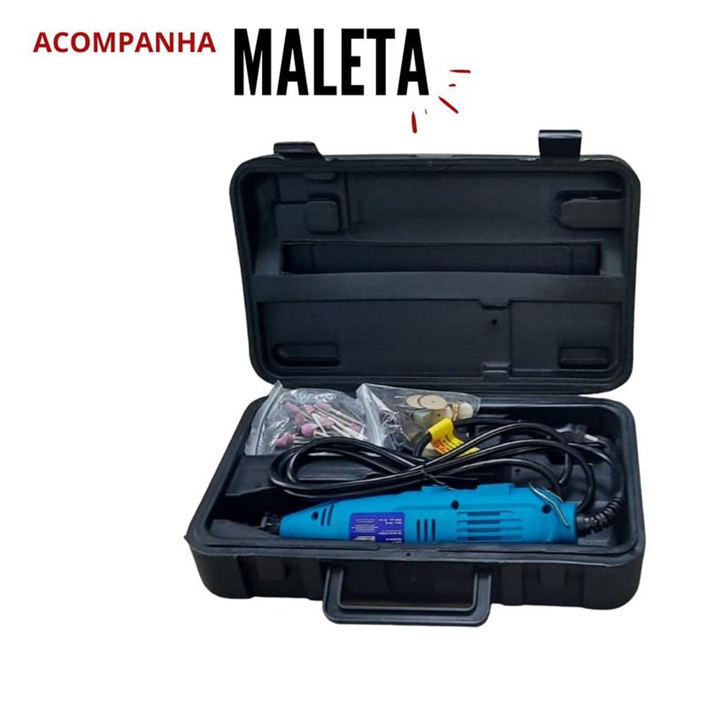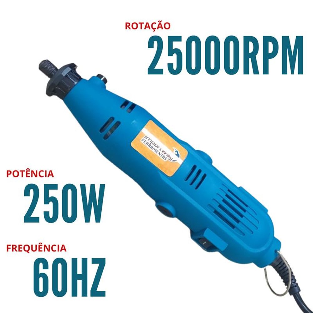 ¿ Potência: 250W ¿ Frequência: 60Hz ¿ Rotação: 25000rpm ¿ Orifício máximo: 3,2mm ¿ Pode ser usada para perfuração, moagem, lixamento, polimento, assim como gravação, corte e remoção de ferrugem em espaços apertados e lugares inacessíveis ¿ Eixo flexível ¿ Cabo com 1,8 metros ¿ Kit com 40 acessórios