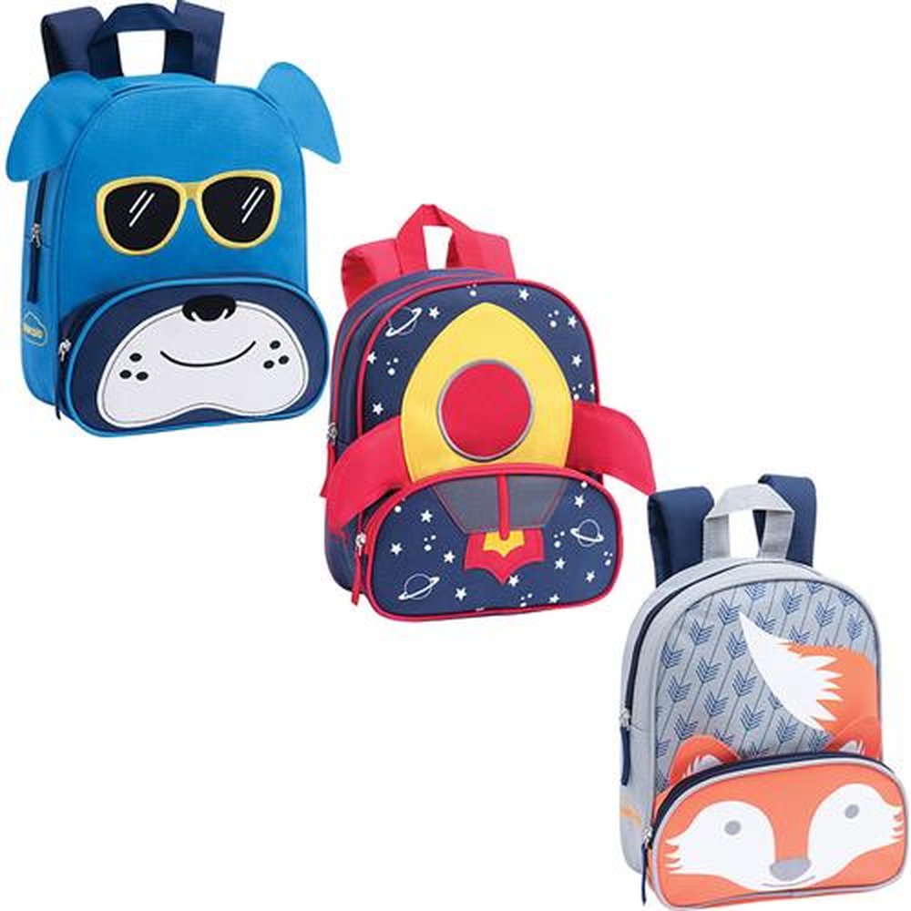 Polibag com 3 unidades, sendo 1 Foguete, 1 Cachorro e 1 Raposa Mochila infantil, estampas coloridas e divertidas em sublimação, tecido resistente, possui bolso frontal.