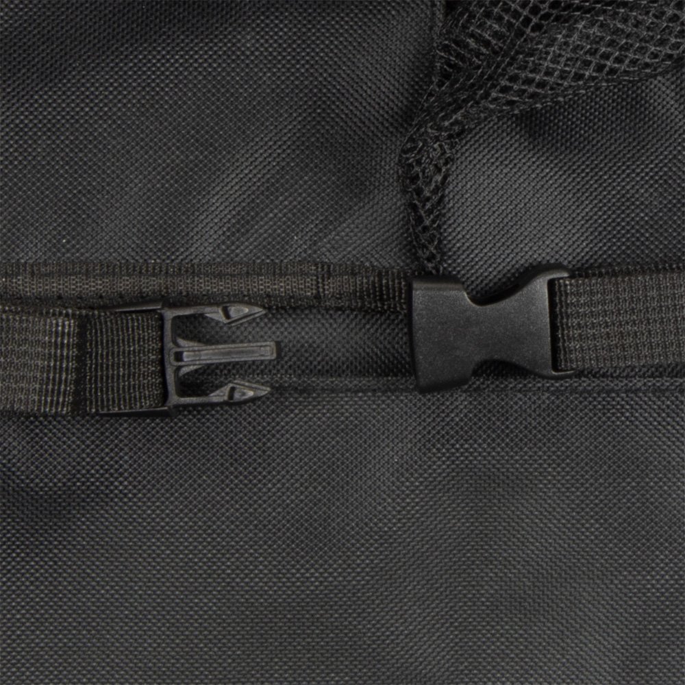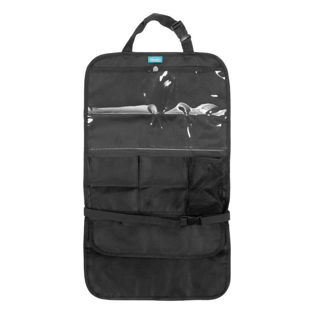 Organizador para banco traseiro de fácil instalação. Com diversos bolsos e um compartimento para tablet. De material sintético, é de fácil conservação. Polibag com 2 unidades iguais na cor preta.