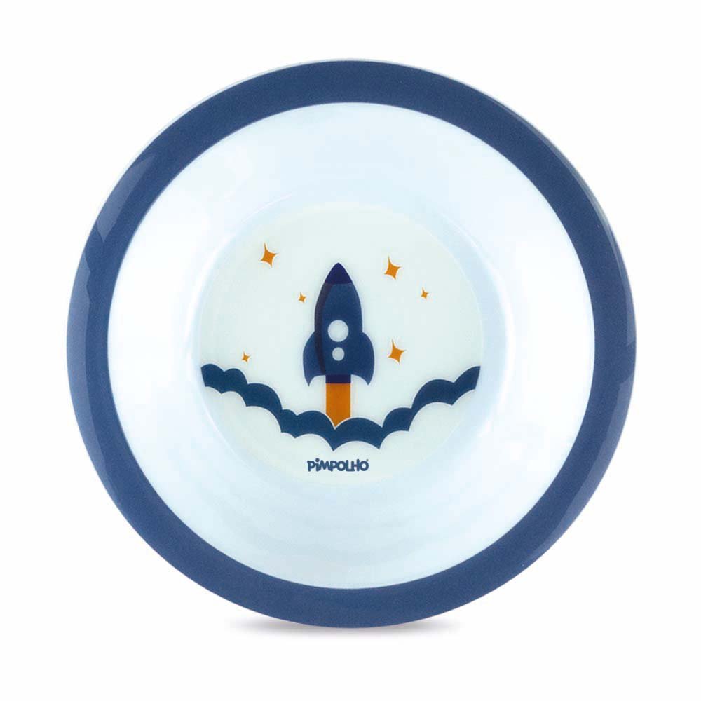 Tigelinha individual Pimpolho, feito em 100% Polipropileno, resistente a quedas e pode ir ao micro-ondas e freezer. Livre de BPA. Polibag com 3 unidades, sendo todas Azul/Foguete.